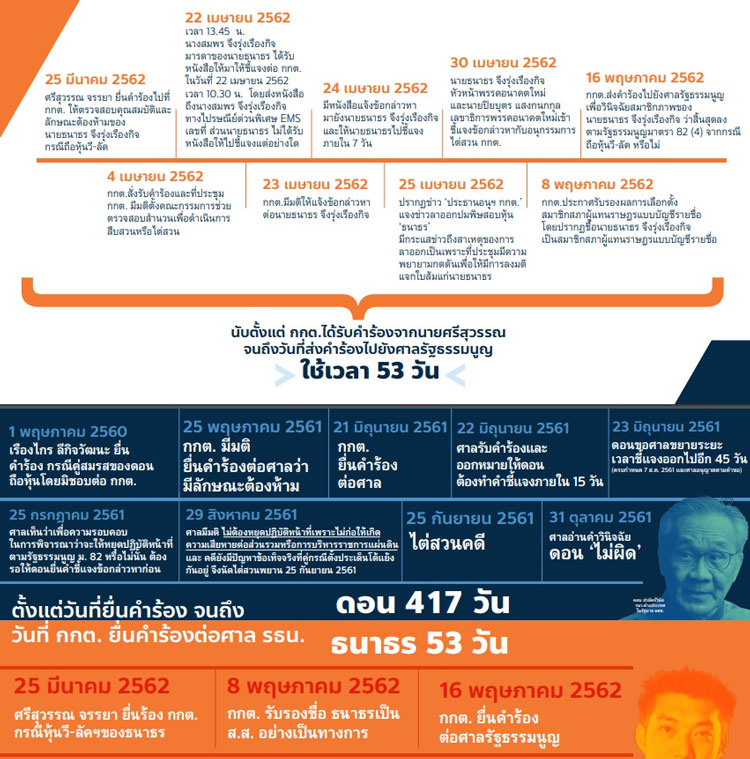 นายปิยบุตร ระบุอีกว่า การตรวจสอบคุณสมบัติและลักษณะต้องห้ามของผู้สมัคร ส.ส.ระบบบัญชีรายชื่อไม่สามารถทำได้ตามกฎหมาย ที่ระบุไว้อย่างชัดเจนว่าให้ทำได้จนถึง 1 วันก่อนการเลือกตั้งเท่านั้น แต่เมื่อ กกต.ตัดสินใจจะทำทั้งๆที่ตัวเองไม่มีอำนาจ จึงเกิดเป็นเรื่องเป็นราวเช่นนี้ขึ้นมา ส่วนขั้นตอนในการพิจารณาของศาลรัฐธรรมนูญนั้น ตามกฎหมายกระบวนพิจารณาความของศาลรัฐธรรมณูญแล้ว จะต้องมีการตั้งองค์คณะชุดเล็กขึ้นมาเพื่อพิจารณาว่าจะรับคำร้องหรือไม่ หากมีมติไม่รับคำร้อง ก็ต้องส่งให้คณะใหญ่เป็นผู้พิจารณา แต่หากมีมติรับคำร้อง ก็ต้องให้ผู้ถูกกล่าวหาชี้แจง ซึ่งตามกำหนดเวลาสามารถทำได้จนถึงวันที่ 8 มิถุนายน ส่วนกรณีกระแสข่าวที่ว่าศาลรัฐธรรมนูญอาจมีคำสั่งให้นายธนาธรหยุดการปฏิบัติหน้าที่ได้นั้น เมื่อเอากรณีของนายดอนมาเทียบกัน ศาลได้ให้เวลานายดอนชี้แจงถึงหนึ่งเดือนก่อนที่จะพิจารณา และผลการพิจารณาก็ออกมาว่านายดอนไม่ต้องยุติปฏิบัติหน้าที่เนื่องจากไม่มีเหตุว่าจะเกิดความเสียหายต่อส่วนรวมหรือการบริหารราชการแผ่นดิน เป็นบรรทัดฐานว่าศาลรัฐธรรมนูญไม่สามารถสั่งให้นายธนาธรหยุดปฏิบัติหน้าที่ในทันทีที่มีการรับคำร้องได้ แต่ต้องให้เวลาในการชี้แจงก่อน นอกจากนี้นายธนาธรแม้ว่าจะเป็น ส.ส.แล้ว แต่ยังไม่ได้ปฏิบัติหน้าที่ เนื่องจากยังไม่ได้ทำการปฏิญาณตนตามที่กำหนดในกฎหมาย การสั่งให้หยุดปฏิบัติหน้าที่จึงเป็นเรื่องที่ไม่สามารถทำได้