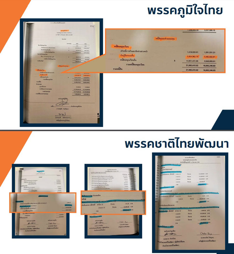 ผู้สื่อข่าวรายงานว่า หลังจากนั้น นายปิยบุตรได้เปิดข้อมูลงบการเงินที่ลงนามรับรองโดยประธาน กกต ที่เก็บเอาไว้ในห้องสมุด กกต.เอง พบว่ามีพรรคภูมิใจไทย, พรรคชาติไทยพัฒนา, พรรคชาติพัฒนา, พรรคประชาธิปไตยใหม่, และพรรคประชาธิปัตย์ ที่มีประวัติการกู้เงินในบัญชีการเงิน หลายกรณีก็ไม่ได้ระบุว่ากู้เงินจากใคร