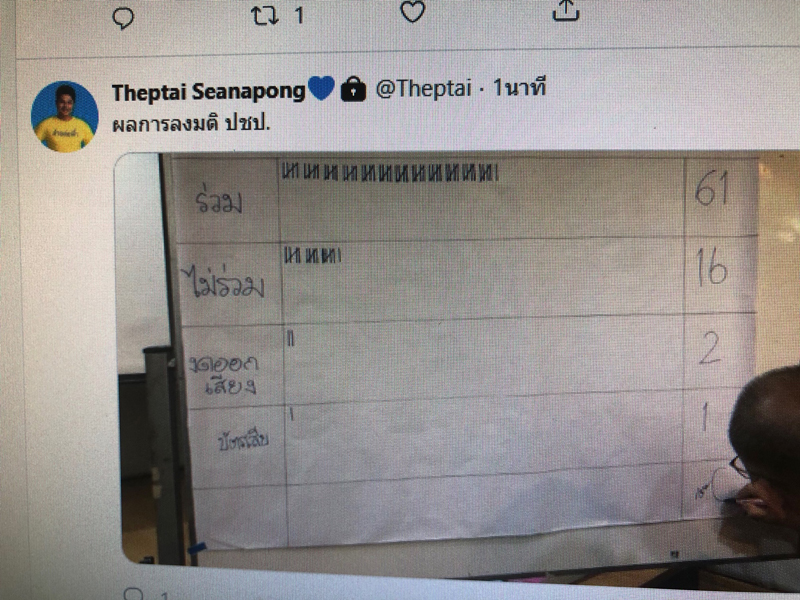 โดยผู้ที่ไม่ได้มาร่วมลงคะแนนจำนวน 2 คนคือนายชวน หลีกภัย ประธานรัฐสภา และนางกันตวรรณ ตันเถียร กุลจรรยาวิวัฒน์ ส.ส.จังหวัดพังงา