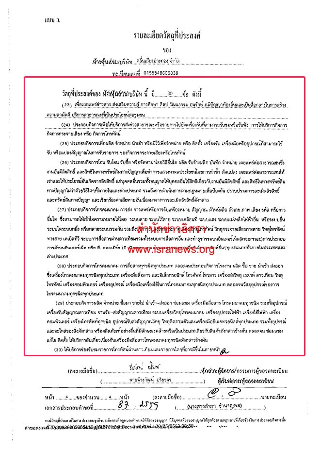 กระทั่ง 22 เม.ย.2559 จดทะเบียนเพิ่มวัตถุที่ประสงค์เป็น 30 ข้อ เกี่ยวข้องกับสื่อตั้งแต่ ข้อ (23) – (30) รวม 7 ข้อ (ดูเอกสาร)