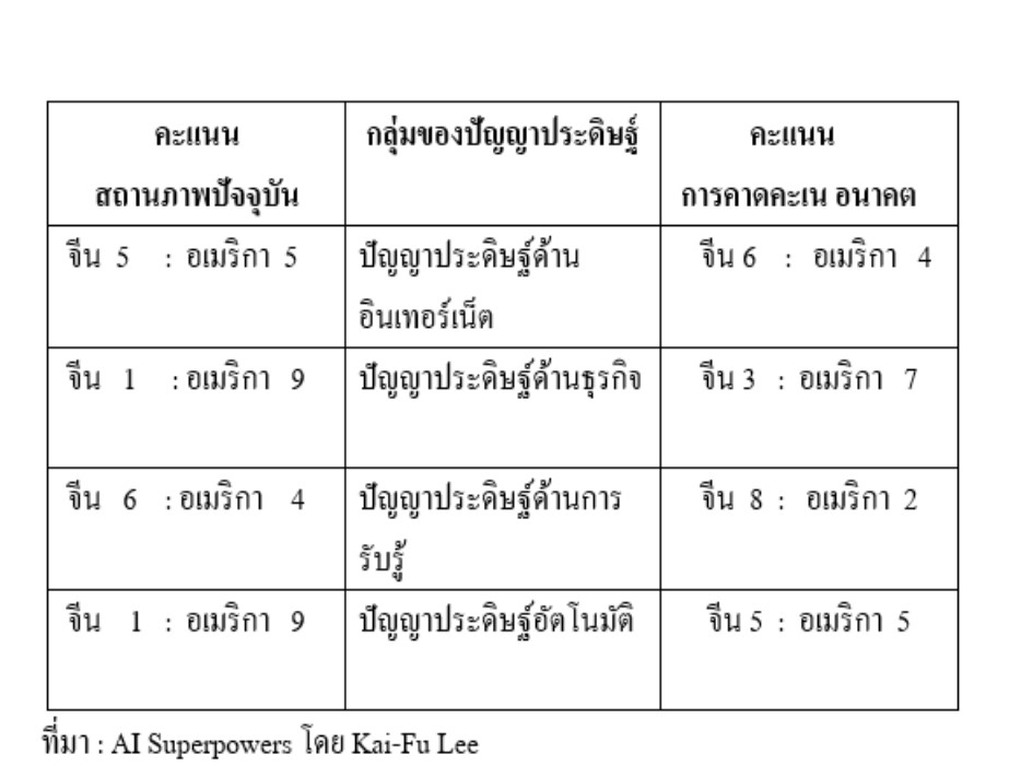 10. ปัญญาประดิษฐ์ในภาพรวม ถ้าแบ่งธุรกิจปัญญาประดิษฐ์ออกเป็น 4 กลุ่มเพื่อดูคะแนนศักยภาพในแต่ละกลุ่มทั้งของจีนและสหรัฐอเมริกา จะพบว่า ปัจจุบันจีนมีคะแนนตามหลังสหรัฐอเมริกาอยู่ในบางด้าน แต่จากการคาดคะเนในอนาคต เชื่อว่า จีนอาจจะตามทันสหรัฐอเมริกาในบางด้านและเหนือกว่าในบางด้าน ดังแสดงในตาราง