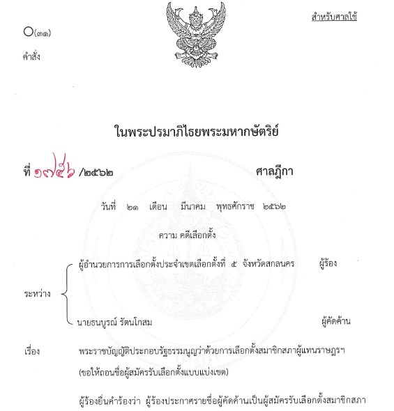 คำพิพากษาศาลฎีกาที่ 1756/2562 วันที่ 21 มีนาคม 2562 ความคดีเลือกตั้ง ระหว่าง ผู้อำนวยการการเลือกตั้งประจำเขตเลือกตั้งที่ 5 จังหวัดสกลนคร ผู้ร้อง นายธนบูรณ์ รัตนโกสม ผู้คัดค้าน