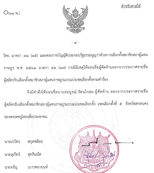 จึงมีคำสั่งให้ถอนชื่อนายธนบูรณ์ รัตนโกสม ผู้คัดค้านออกจากประกาศรายชื่อผู้สมัครรับเลือกตั้งสมาชิกสภาผู้แทนราษฎร แบบแบ่งเขตเลือกตั้ง เขตเลือกตั้งที่ 5 จังหวัดสกลนคร ของพรรคครูไทยเพื่อประชาชน