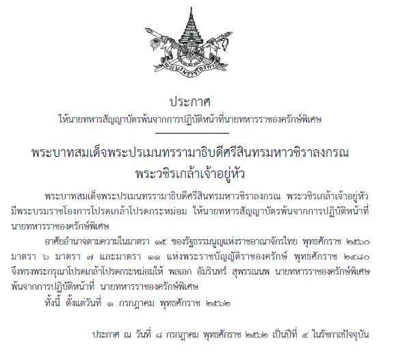 สำนักข่าวอิศรา www.isranews.org รายงานว่า ราชกิจจานุเบกษาวันที่ 8 ก.ค.2562 เผยแพร่ ประกาศให้นายทหารสัญญาบัตรพ้นจากการปฏิบัติหน้าที่นายทหารราชองครักษ์พิเศษ