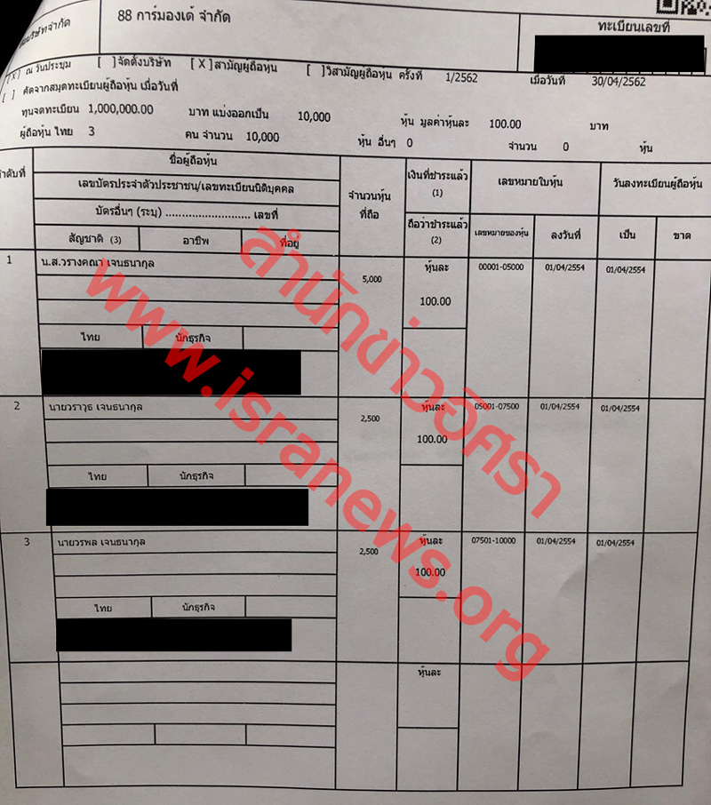 ดูชัดๆ เอกสารจดทะเบียนตั้ง 88 การ์มองเต้ รีสอร์ต จัดสัมมนา ส.ส.พปชร. ‘เอ-วราวุธ’ 3 พี่น้อง ‘เจนธนากุล’ ก่อตั้ง-ถือหุ้น-นั่ง กก. ‘พี่สาว’ ถือหุ้นใหญ่สุด 50% รายได้ 3 ปีหลังสุดขาดทุนต่อเนื่อง ก่อนโดน ทส. ตามสอบปมรุกที่อุทยานทับลาน