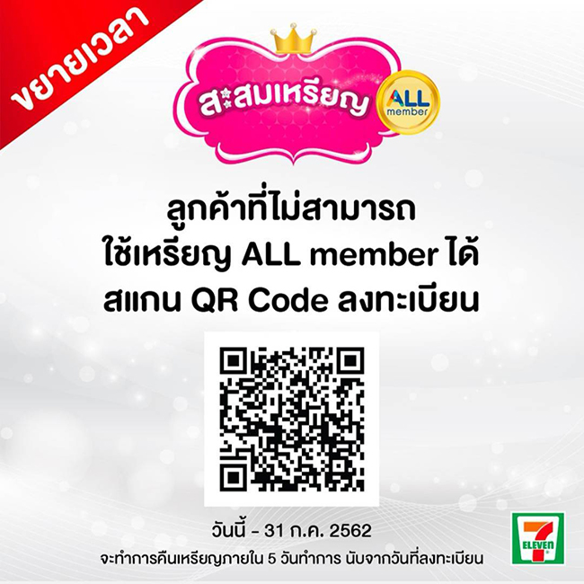 นายยุทธศักดิ์ ภูมิสุรกุล รองกรรมการผู้จัดการอาวุโส บริษัท ซีพี ออลล์ จำกัด (มหาชน) ผู้ก่อตั้งร้านเซเว่น อีเลฟเว่นในประเทศไทย เปิดเผยว่า เนื่องจากในช่วงที่ผ่านมามีลูกค้าให้ความสนใจใช้บริการแลกเหรียญ All Member เป็นจำนวนมากและไม่สามารถใช้เหรียญ All Member ได้ทันภายในระยะเวลาที่กำหนด เพื่ออำนวยความสะดวกให้สมาชิก เซเว่น อีเลฟเว่นจึงขอขยายระยะเวลาในการลงทะเบียนรับสิทธิได้ตั้งแต่วันที่ 24 กรกฎาคม ถึง วันที่ 31 กรกฎาคม 2562 โดยลงทะเบียนได้ที่ Link : http://nav.cx/h33UFgE และบริษัทฯ จะทำการคืนเหรียญภายใน 5 วันทำการ นับจากวันที่ลงทะเบียน