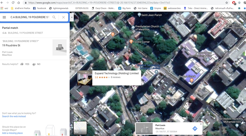 เมื่อสำนักข่าวอิศรา นำที่อยู่ ตึก C.A. ถนน 19 POUDRIERE เมือง PORT LOUIS ประเทศมอริเชียส มาสืบค้นข้อมูลเพิ่มเติม ผ่านเว็บไซต์ Google.maps พบว่า เป็นย่านที่ตั้งบริษัท Expand Technology (ดูภาพประกอบ)