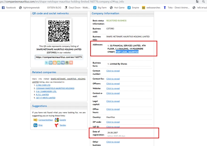 ล่าสุด สำนักข่าวอิศรา ตรวจสอบข้อมูล บริษัท เชป เนทเชปฯ เพิ่มเติม พบว่า ในเว็บไซต์ companiesmauritius.com แจ้งว่า บริษัท เชป เนทเชปฯ ใช้ที่อยู่ของ บริษัท SG FINANCIAL SERVICES LIMITED ตั้งอยู่ชั้น 4 ตึก C.A. ถนน 19 POUDRIERE เมือง PORT LOUIS ประเทศมอริเชียส จดทะเบียนเมื่อวันที่ 29 ส.ค. 2550