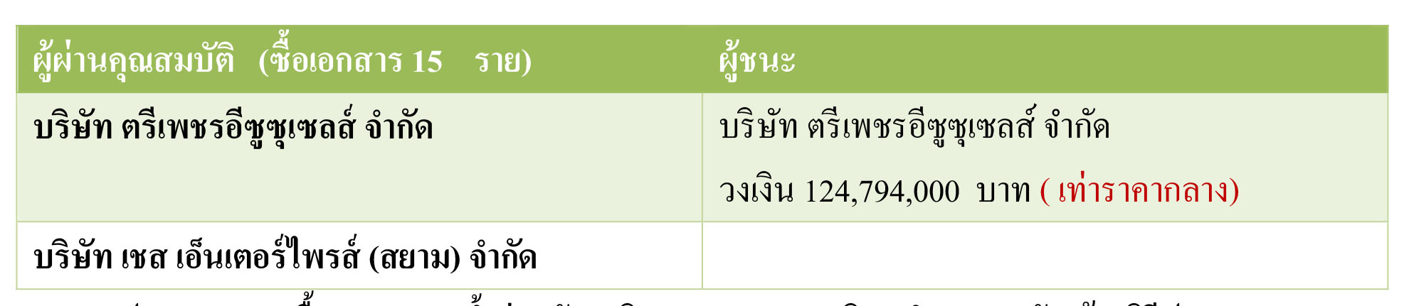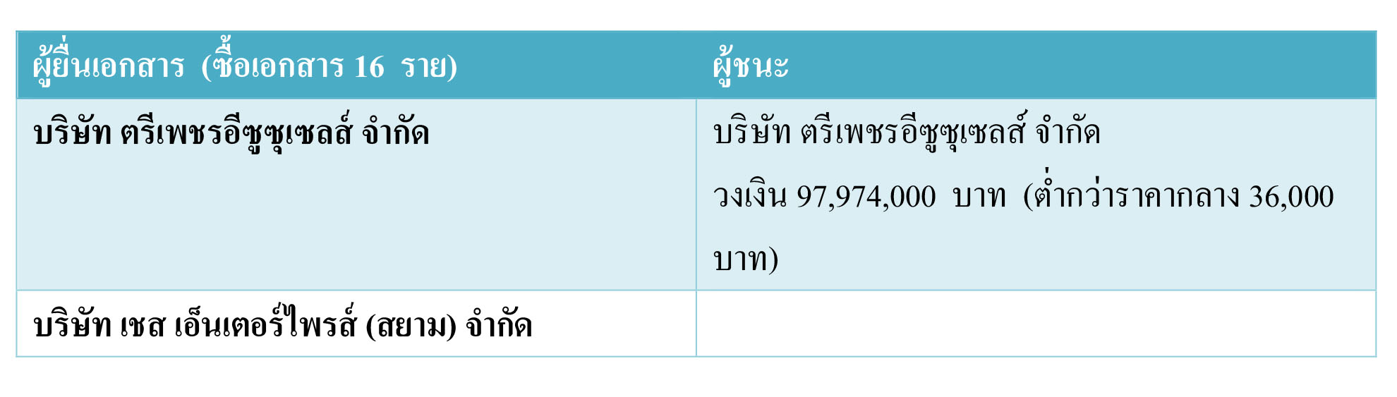 น่าสังเกตว่า 2 รายการที่ บริษัท ตรีเพชรอีซูซุเซลส์ จำกัด เป็นผู้ชนะ มีบริษัท เชส เอ็นเตอร์ไพรส์ (สยาม) จำกัด เป็นผู้ร่วมเสนอราคา (คู่เทียบ)