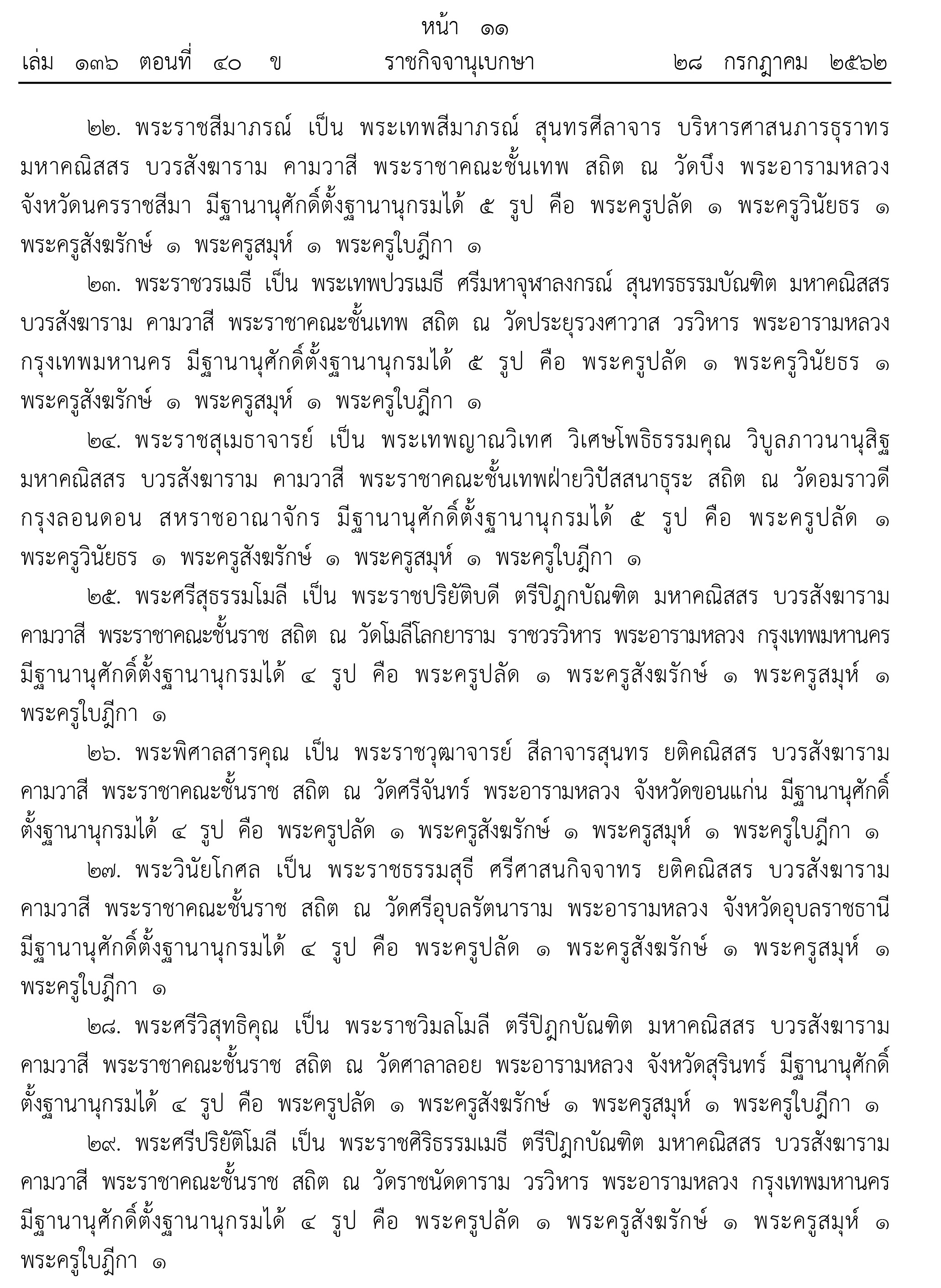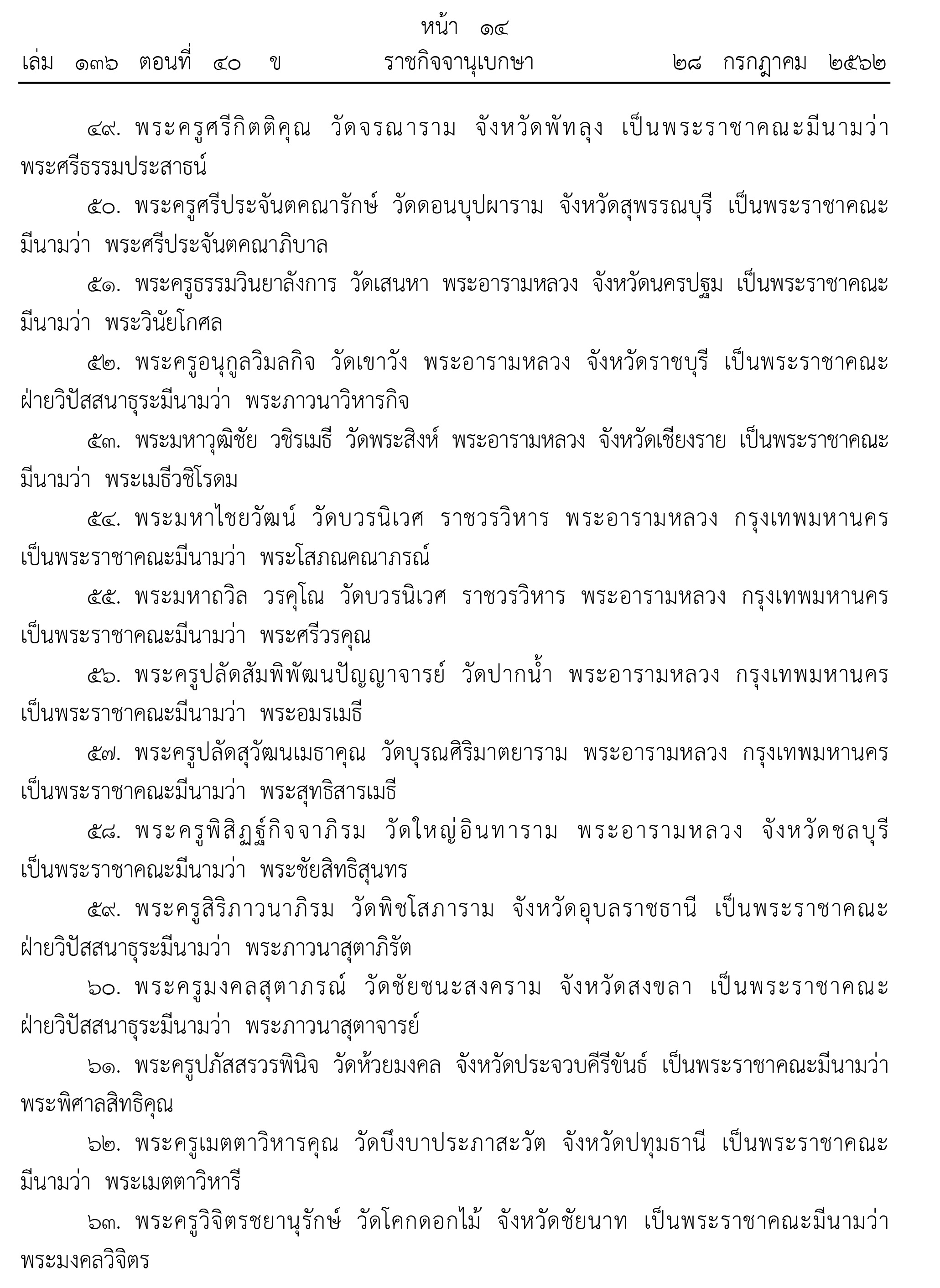 โดยพระบาทสมเด็จพระปรเมนทรรามาธิบดีศรีสินทรมหาวชิราลงกรณ มหิศรภูมิพลราชวรางกูร กิติสิริสมบูรณอดุลยเดช สยามินทราธิเบศรราชวโรดม บรมนาถบพิตร พระวชิรเกล้าเจ้าอยู่หัว มีพระบรมราชโองการโปรดพระราชทานสัญญาบัตรตั้งสมณศักดิ์พระราชาคณะ ในโอกาสพระราชพิธีเฉลิมพระชนมพรรษา วันที่ 28 กรกฎาคม พุทธศักราช 2562 จำนวน 65 รูป ตามบัญชีรายนามพระสงฆ์แนบท้าย