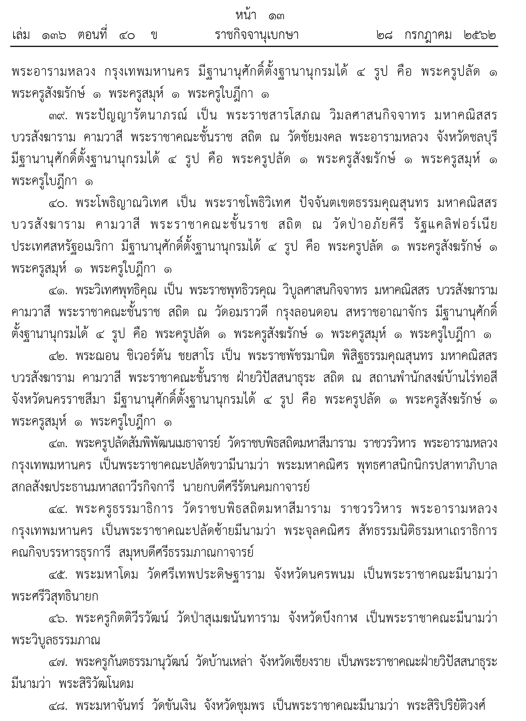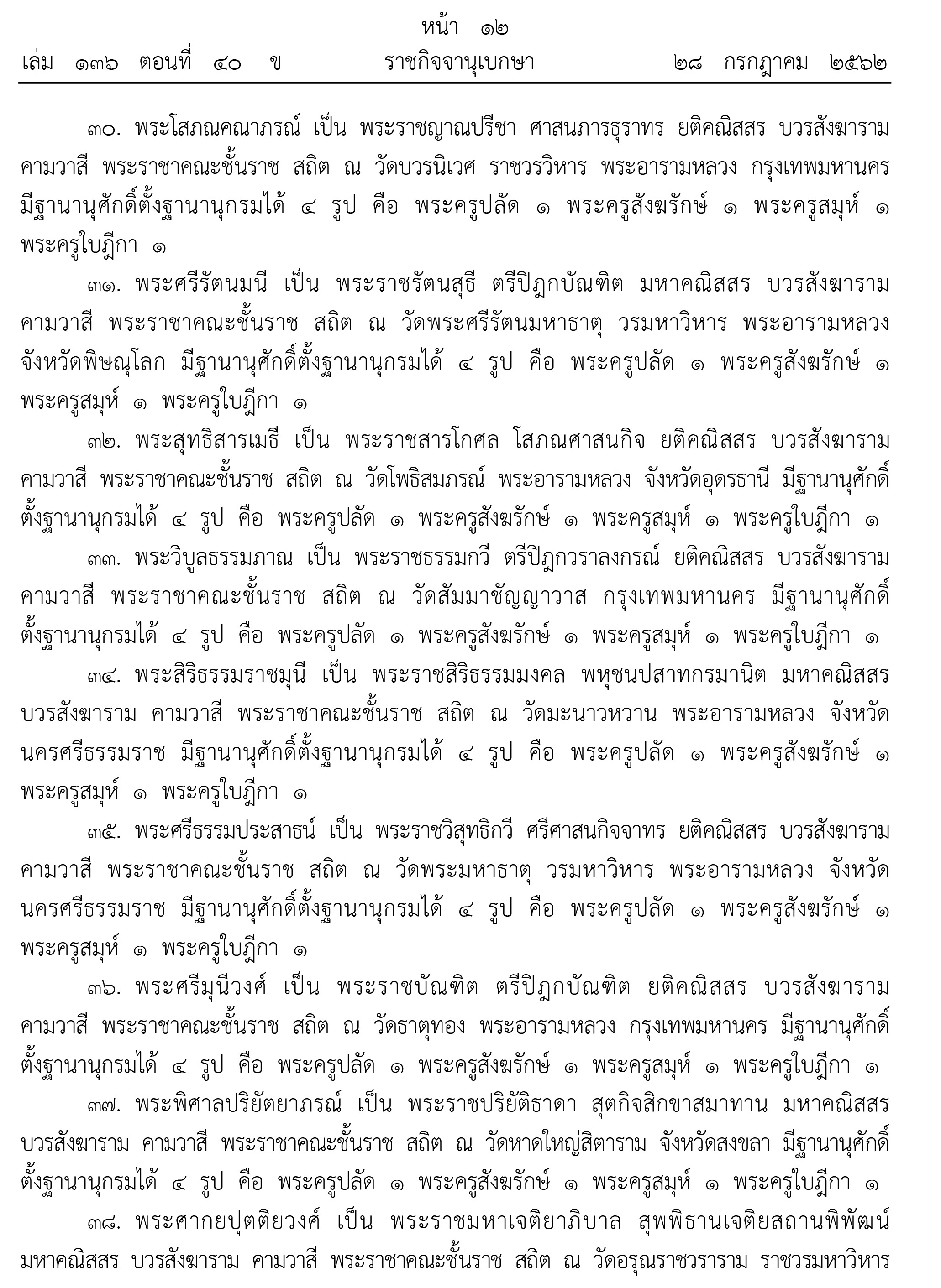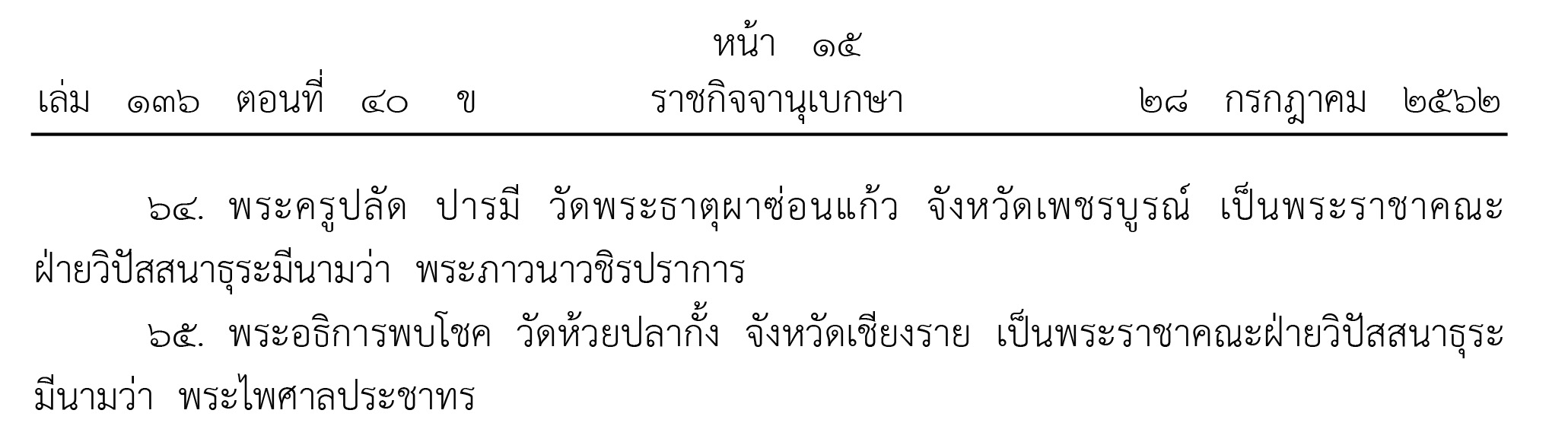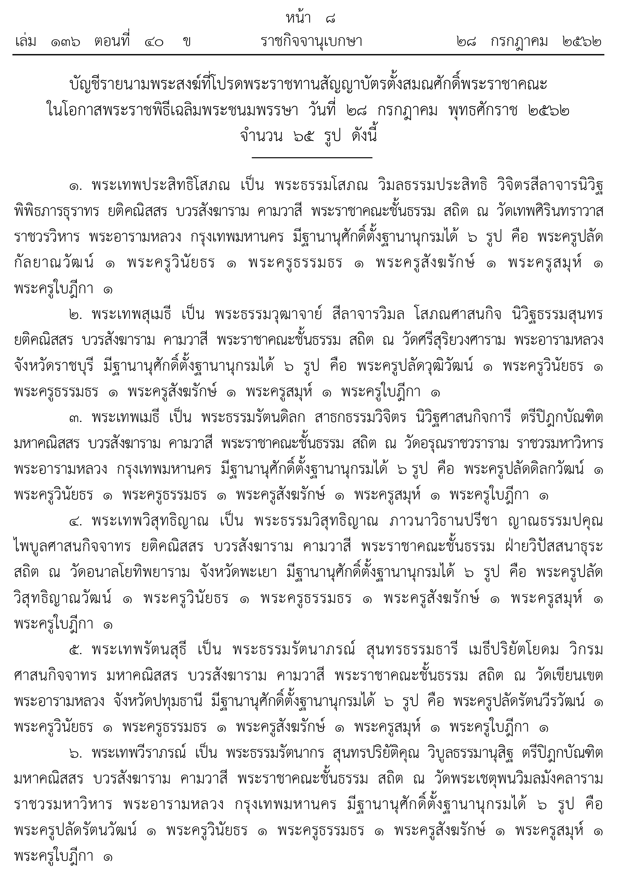 สำนักข่าวอิศรา www.isranews.org รายงานว่า เมื่อวันที่ 28 ก.ค.2562 ราชกิจจานุเบกษา ได้เผยแพร่ประกาศเรื่อง พระราชทานสัญญาบัตรตั้งสมณศักดิ์ 65 รูป