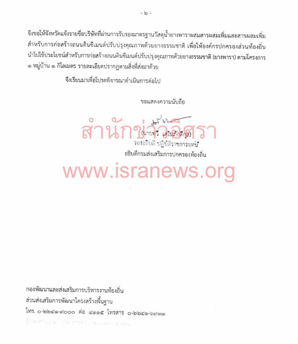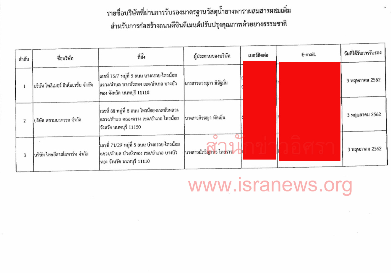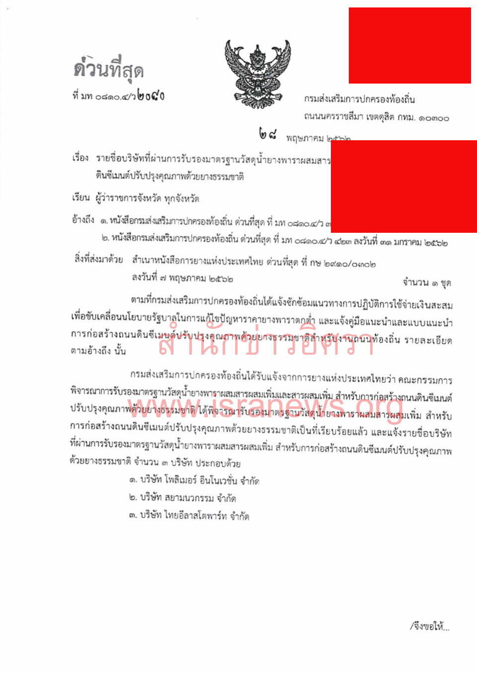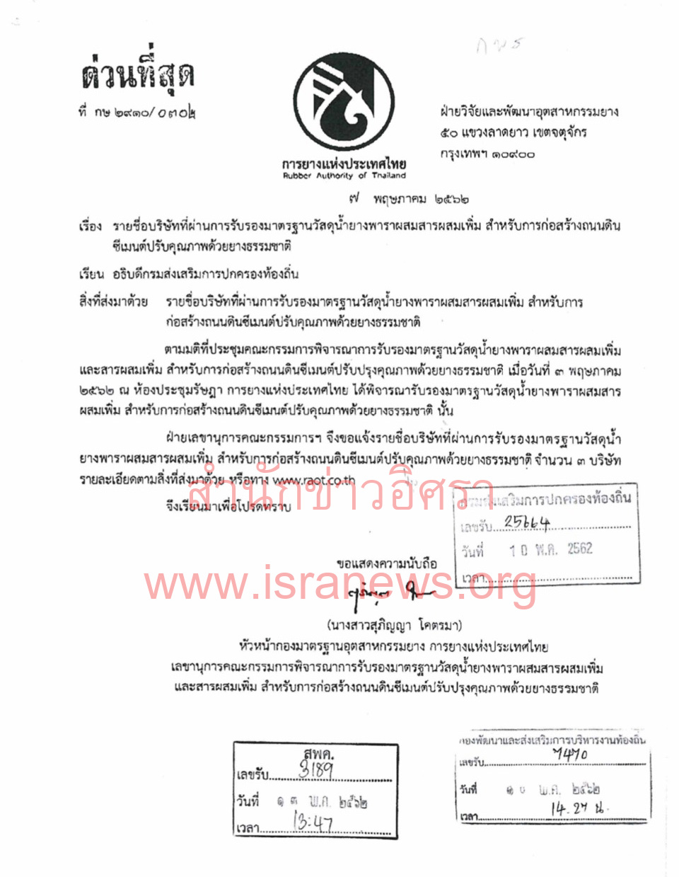 "....สำนักข่าวอิศรา สืบค้นข้อมูลพบว่า เมื่อวันที่ 7 พ.ค.2562 กยท.ได้ทำหนังสือแจ้งถึงอธิบดีกรมส่งเสริมการปกครองท้องถิ่น (สถ.) เพื่อแจ้งรายชื่อบริษัทเอกชน 3 ราย คือ บริษัท โพลิเมอร์ อินโนเวชั่น จำกัด บริษัท สยามนวกรรม จำกัด และ บริษัท ไทย อีลาสโตพาร์ท จำกัด ที่ผ่านการรับรองมาตรฐานวัสดุน้ำยางพาราผสมสารผสมเพิ่ม สำหรับการก่อสร้างถนนดินซีเมนต์ปรับปรุงคุณภาพด้วยยางธรรมชาติ ที่ผ่านการรับรองจาก คณะกรรมการพิจารณารับรองมาตรฐานวัสดุผลิตภัณฑ์ ของกระทรวงเกษตรและสหกรณ์แล้ว..."