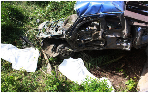 บรรยายภาพ : ความเสียหายอย่างยับเยินของรถเจ้าหน้าที่ตำรวจที่ตกเป็นเป้า "คาร์บอมบ์" เที่ยวล่าสุด (ภาพโดย อะหมัด รามันห์สิริวงศ์)