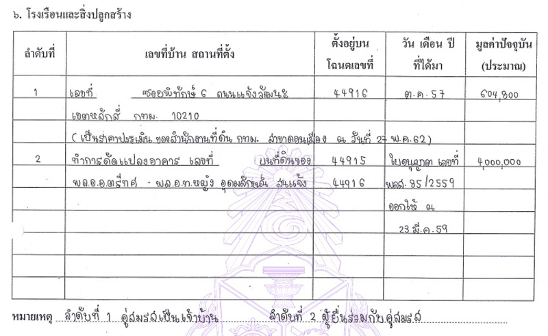 สำหรับทรัพย์สินในส่วนอาคารของ พล.อ.อ.ตรีทศ แจ้งว่า ทำการดัดแปลงอาคาร บนที่ดินของ พล.อ.อ.ตรีทศ และ พล.อ.ท.หญิง อุดมลักษณ์ จำนวน 2 แปลง ได้ใบอนุญาตเลขที่ พลส.85/2559 เมื่อวันที่ 23 มี.ค. 2559 มูลค่า 4 ล้านบาท