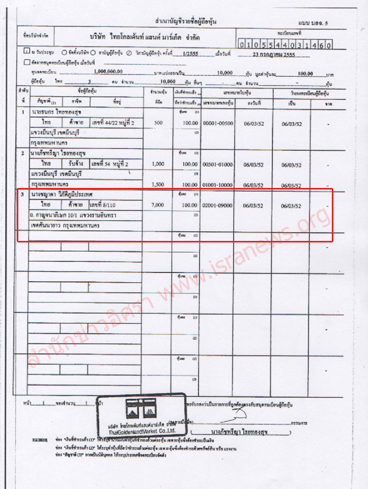 จากการตรวจสอบข้อมูลกับกรมพัฒนาธุรกิจการค้าพบว่า บริษัท ไทยโกลเด้นท์ แลนด์ มาร์เก็ต จำกัด จดทะเบียนวันที่ 29 มี.ค. 2544 ทุน 1 ล้านบาท ประกอบธุรกิจ เช่าอสังหาริมทรัพย์ ที่ตั้งเลขที่ 55/1 หมู่ที่ 2 ถนนบุรีภิรมย์ แขวงกระทุ่มราย เขตหนองจอก กรุงเทพมหานคร นางชญาดาขณะชื่อ น.ส.ชัชฏา ไทยทองสุข ถือหุ้นตั้งแต่ก่อตั้ง จำนวน 1,000 หุ้น ต่อมา วันที่ 6 มี.ค.2552 เพิ่มเป็น 7,000 หุ้น