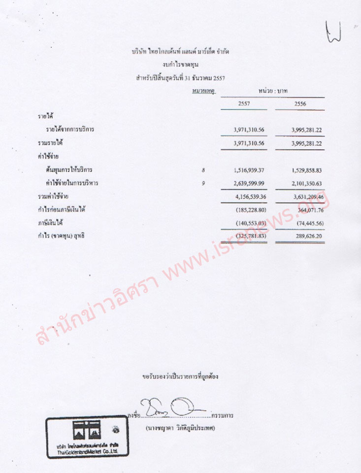 แจ้งงบการเงินรอบปี 2558 รายได้รวม 4,283,632.23 บาท กำไรสุทธิ 156,500.58 บาท สินทรัพย์ 6,578,125.63 บาท หนี้สิน 980,780 บาท กำไรสะสม 4,597,345.63 บาท