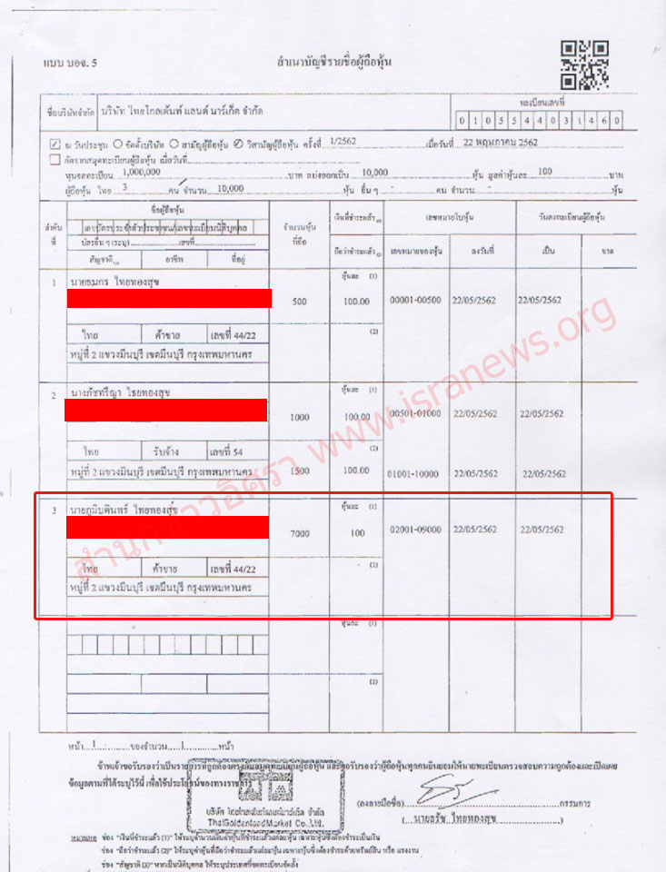 กระทั่งล่าสุด 22 พ.ค.2562 นางชญาดา ได้โอนหุ้นให้ นายภูมิบดินทร์ ไทยทองสุข 7,000 หุ้น ขณะที่ นายธนกร ไทยทองสุข ถือ 500 หุ้น นางภัชทรีญา ไทยทองสุข 2,500 หุ้น