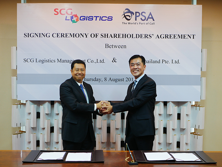 เอสซีจี โดย นายนิธิ ภัทรโชค (ซ้าย) กรรมการผู้จัดการใหญ่ ธุรกิจซีเมนต์และผลิตภัณฑ์ก่อสร้าง ในนามตัวแทนของ บริษัท เอสซีจี โลจิสติกส์ แมเนจเม้นท์ จำกัด และ นาย อง กิม ปง (ขวา) Regional CEO (South-East Asia), PSA International ในนามตัวแทนของบริษัท PSA Thailand ลงนามความร่วมมือจัดตั้งบริษัทร่วมทุน SCG-PSA Holdings Co., Ltd เพื่อเพิ่มประสิทธิภาพการให้บริการโลจิสติกส์ให้กับลูกค้าแบบครบวงจร โดยครอบคลุมตั้งแต่การให้บริการท่าเรือ การขนถ่ายสินค้านำเข้า-ส่งออกระหว่างประเทศ และการขยายการบริการขนส่งระหว่างท่าเรือภายในประเทศและระหว่างประเทศ ต่อยอดธุรกิจซัพพลายเชนในภูมิภาคเอเชียตะวันออกเฉียงใต้และจีน โดยมีศูนย์กลางการดำเนินงานที่ อ.พระประแดง จ.สมุทรปราการ ซึ่งเป็นจุดยุทธศาสตร์ที่สามารถเชื่อมโยงธุรกิจโลจิสติกส์ทางเรือระหว่างกรุงเทพฯ และย่านนิคมอุตสาหกรรมชั้นนำของประเทศได้อย่างครบวงจรและครอบคลุมปลายทางได้มากยิ่งขึ้น อาทิ ท่าเรือแหลมฉบัง ตลอดจนช่วยตอบโจทย์ลูกค้าที่ต้องการขนส่งสินค้าไปยังปลายทางอื่น ๆ อาทิ ประเทศในกลุ่มอาเซียน ยุโรป หรืออเมริกา ได้หลากหลายขึ้น