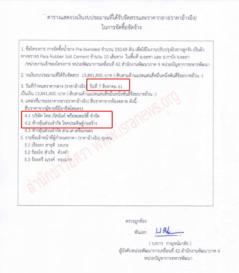 จากการตรวจสอบยังพบว่า ในช่วงก่อนหน้านั้น เมื่อวันที่ 7 ส.ค.2561 บริษัท ไทย ภัสนันท์ พร๊อพเพอร์ตี้ จำกัด ห้างหุ้นส่วนจำกัด (หจก.) โชคประดิษฐ์ก่อสร้าง ปรากฏชื่อเป็นแหล่งที่มาของการสืบราคากลาง เพื่อใช้ในการจัดซื้อน้ำยาง จำนวน 230.69 ตัน เพื่อใช้ในการปรับปรุงผิวทางลูกรัง ของ หน่วยพัฒนาการเคลื่อนที่ 42 สำนักงานพัฒนาภาค 4 หน่วยบัญชาการทหารพัฒนา
