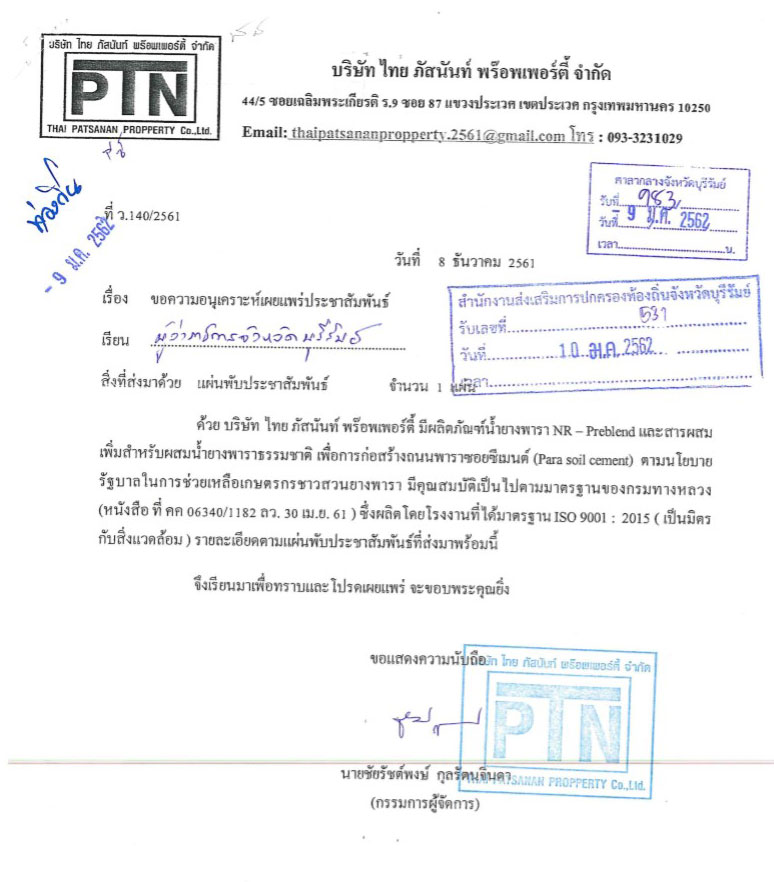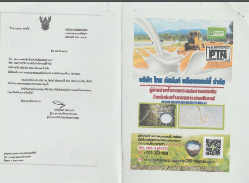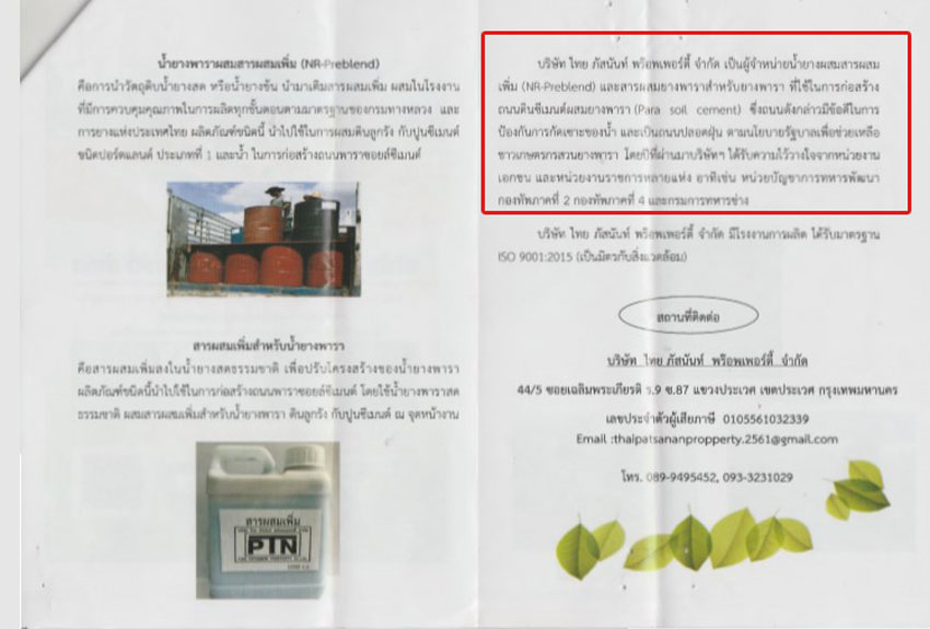 จากการตรวจสอบยังพบอีกว่า ต่อมาในช่วงต้นเดือน ธ.ค. 2561 บริษัท ไทย ภัสนันท์ พร๊อพเพอร์ตี้ จำกัด ได้ทำหนังสือแจ้งประชาสัมพันธ์เสนอขายผลิตภัณฑ์น้ำยางพาราผสมสารผสมเพิ่ม ที่ใช้ในการทำถนนยางพาราซอยซีเมนต์ ต่อหน่วยงานราชการหลายแห่ง แต่เปลี่ยนเนื้อหาใหม่ ระบุว่า มีผลิตภัณฑ์น้ำยางพารา และสารผสมเพิ่มสำหรับผสมน้ำยางพาราธรรมชาติ เพื่อการก่อสร้างถนนพาราซอยซีเมนต์ ตามนโยบายรัฐบาลในการช่วยเหลือเกษตรกรชาวสวนยางยาพรา มีคุณสมบัติเป็นไปตามมาตรฐานของกรมทางหลวง พร้อมระบุว่า ปีที่ผ่านมา บริษัทฯ ได้รับความไว้วางใจจากหน่วยงานเอกชน และหน่วยงานราชการหลายแห่ง อาทิเช่น หน่วยบัญชาการทหารพัฒนา กองทัพภาคที่ 2 กองทัพภาคที่ 4 และกรมการทหารช่าง (file:///C:/Users/com/Desktop/core_dispatch_185701_1.pdf)