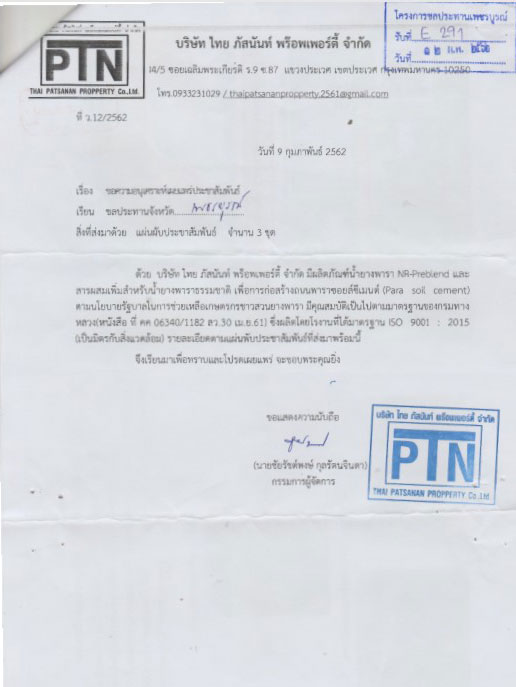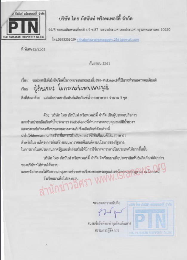 ในช่วงเดือนก.ย.2561 บริษัท ไทย ภัสนันท์ พร๊อพเพอร์ตี้ จำกัด ได้ทำหนังสือแจ้งประชาสัมพันธ์เสนอขายผลิตภัณฑ์น้ำยางพาราผสมสารผสมเพิ่ม ที่ใช้ในการทำถนนยางพาราซอยซีเมนต์ ต่อหน่วยงานราชการหลายแห่ง โดยอ้างว่า เป็นผู้ประกอบกิจการและจำหน่ายผลิตภัณฑ์น้ำยางพารา ที่ผ่านการทดสอบคุณสมบัติน้ำยาง ตรงตามข้อกำหนดของ กรมทางหลวง (ดูเอกสารประกอบ http://ridceo.rid.go.th/petboon/idea/e1735-61.pdf)