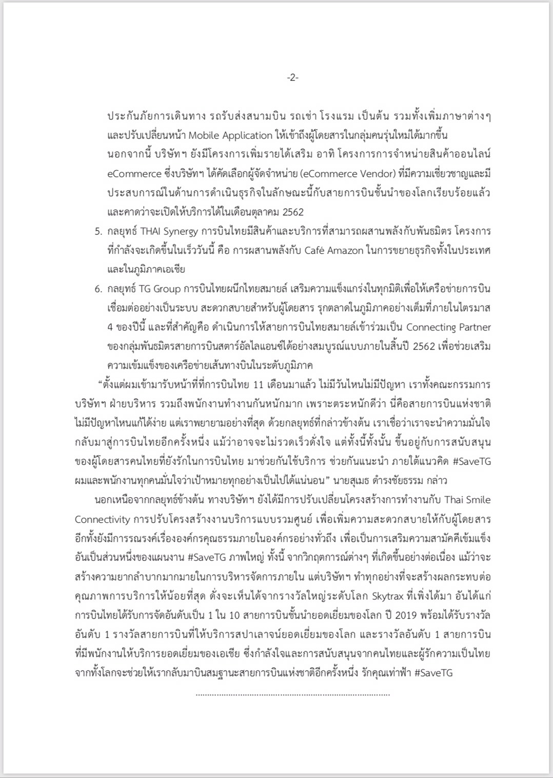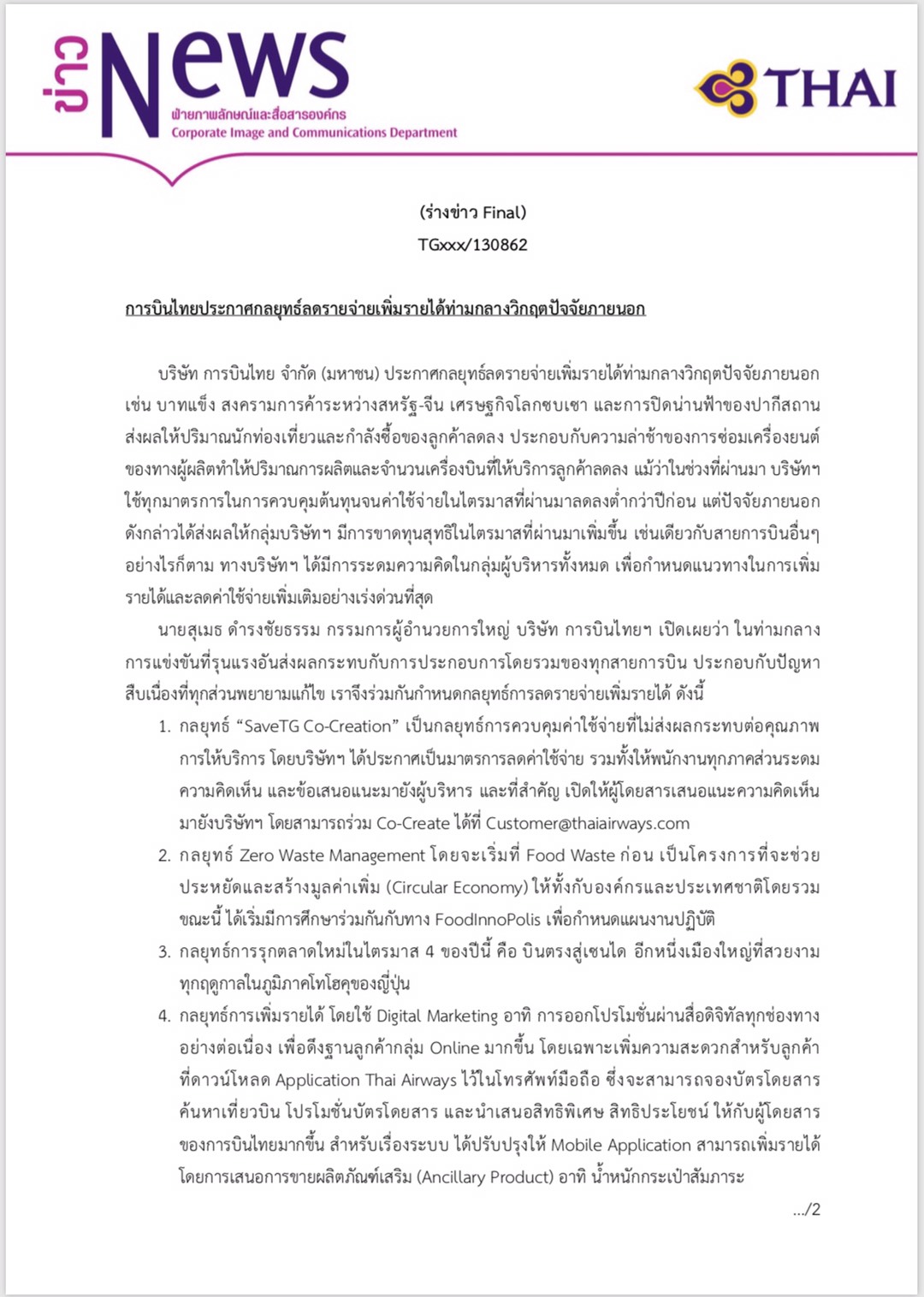 1. กลยุทธ์ “SaveTG Co-Creation” เป็นกลยุทธ์การควบคุมค่าใช้จ่ายที่ไม่ส่งผลกระทบต่อคุณภาพการให้บริการโดยบริษัทฯ ได้ประกาศเป็นมาตรการลดค่าใช้จ่าย รวมทั้งให้พนักงานทุกภาคส่วนระดม ความคิดเห็น และข้อเสนอแนะมายังผู้บริหาร และที่สําคัญ เปิดให้ผู้โดยสารเสนอแนะความคิดเห็นมายังบริษัทฯ โดยสามารถร่วม Co-Create ได้ที่ [email protected]