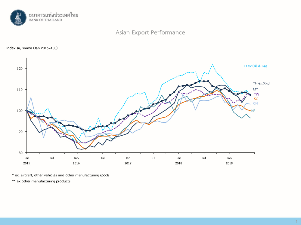 "ประเทศไทยเป็นประเทศเล็กที่มีเศรษฐกิจเปิด คงหลีกเลี่ยงผลกระทบต่อการส่งออกได้ยาก ทั้งนี้ ภาครัฐได้ช่วยประคองเศรษฐกิจในด้านการใช้จ่ายในประเทศ ทั้งการบริโภคและการลงทุนซึ่งจะช่วยยกระดับความสามารถในการแข่งขันของประเทศ หากเทียบกับประเทศในภูมิภาค การส่งออกของไทยนับว่ายังกระจายตัว ทั้งในด้านประเทศคู่ค้าและด้านสินค้าที่ส่งออก ทำให้การลดลงของการส่งออกไทยในช่วง 6 เดือนที่ผ่านมาน้อยกว่าหลายๆ ประเทศ เช่น กลุ่มที่ส่งออกสินค้าอิเล็กทรอนิกส์"