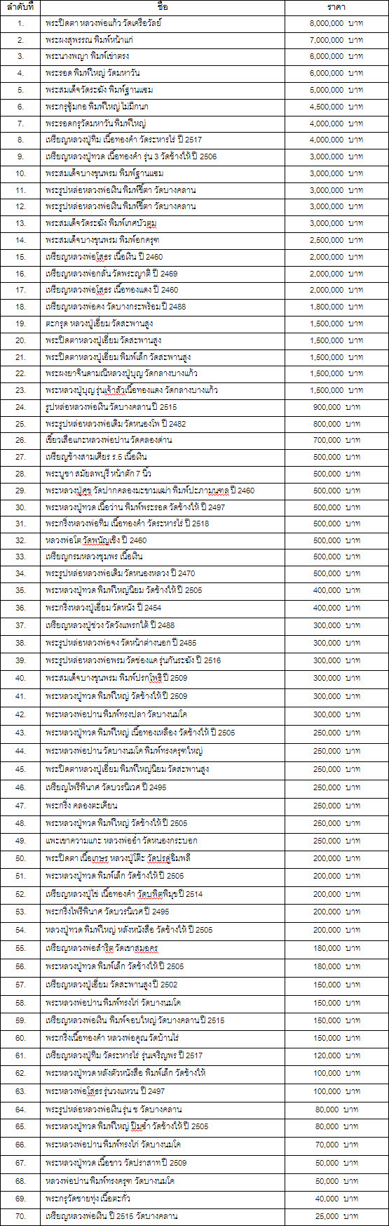 ตารางแสดงราคา “พระเครื่อง” ของ การุณ โหสกุล ที่แจ้ง ป.ป.ช.