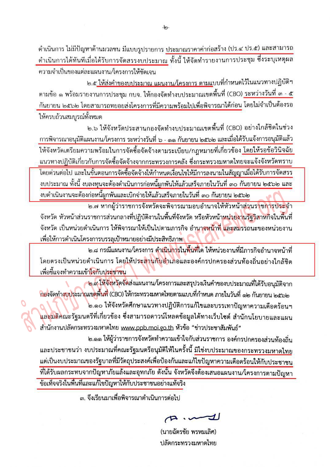 2. ให้ผู้ว่าราชการจังหวัดเน้นย้ำหัวหน้าสํานักงานจังหวัดให้ความสําคัญในการบูรณาการ และประสานการปฏิบัติกับส่วนราชการที่เกี่ยวข้อง และให้ชี้แจงแก่ส่วนราชการที่จะเสนอขอรับการสนับสนุน งบประมาณในการดําเนินโครงการ ให้มีเป้าหมายมุ่งเน้นการแก้ไขปัญหาจําเป็นเร่งด่วนตามนโยบายรัฐบาล โดยไม่กําหนดวงเงินงบประมาณรายโครงการ แต่ให้พิจารณาตามสภาพปัญหาและข้อเท็จจริงที่เกิดขึ้น โดยให้มี การกระจายพื้นที่ในการแก้ไขปัญหาและบูรณาการการดําเนินงานของส่วนราชการที่รับผิดชอบตามแนวทาง ของมติคณะรัฐมนตรีเมื่อวันที่ 20 สิงหาคม 2562