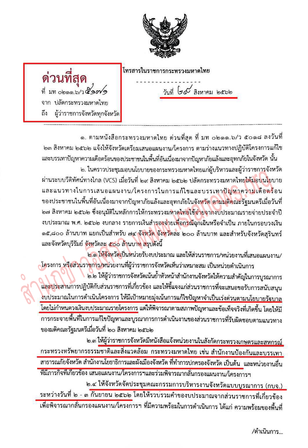 สำนักข่าวอิศรา www.isranews.org ตรวจสอบพบว่า ก่อนหน้านี้ เมื่อวันที่ 29 ส.ค. 2562 นายฉัตรชัย พรหมเลิศ ปลัดกระทรวงมหาดไทย ได้ส่งโทรสารในราชการกระทรวงมหาดไทย ด่วนที่สุด แจ้งเวียนไปถึง ผู้ว่าราชการจังหวัดทุกจังหวัด เพื่อให้รับทราบแนวทางปฏิบัติการใช้จ่ายเงินงบประมาณผ่านโครงการแก้ไข และบรรเทาปัญหาความเดือดร้อนของประชาชนในพื้นที่อันเนื่องมาจากปัญหาภัยแล้งและอุทกภัยในจังหวัด วงเงินกว่า 15,800 ล้านบาท