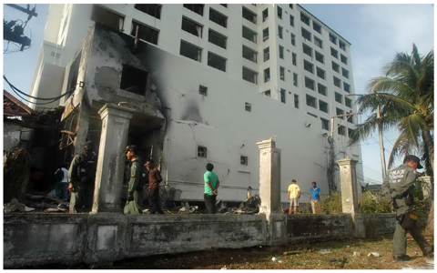 1 สภาพอาคารโรงแรม ซี.เอส.ปัตตานี ได้รับความเสียหายค่อนข้างหนักหลังโดนโจมตีด้วยคาร์บอมบ์ด้านหลังโรงแรม (ภาพโดย สุเมธ ปานเพชร)