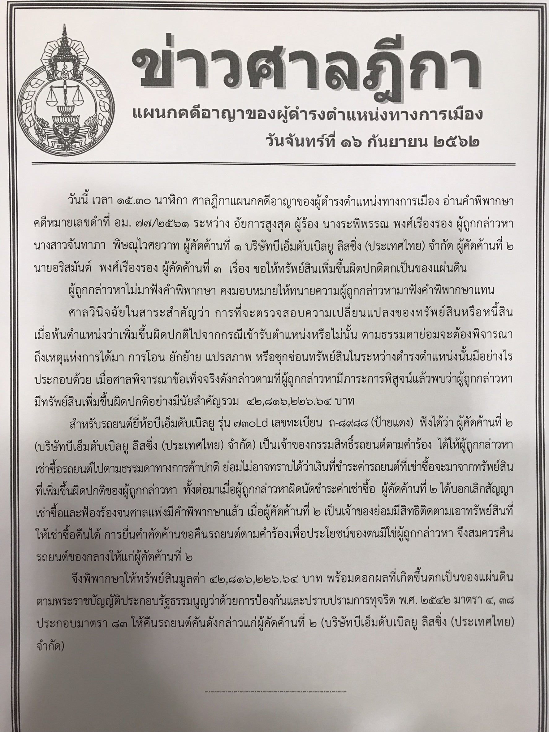 วันเดียวกัน ศาลฎีกาแผนกคดีอาญาของผู้ดำรงตำแหน่งทางการเมือง อ่านคำพิพากษาคดีที่อัยการสูงสุด (อสส.) เป็นผู้ร้องยื่นฟ้อง นางระพิพรรณ พงศ์เรืองรอง เป็นผู้ถูกกล่าวหา มี น.ส.จันทาภา พิษณุไวศยวาท ผู้คัดค้านที่ 1 บริษัท บีเอ็มดับเบิลยู ลิสซิ่ง (ประเทศไทย) จำกัด ผู้คัดค้านที่ 2 นายอริสมันต์ พงศ์เรืองรอง ผู้คัดค้านที่ 3 เรื่อง ขอให้ทรัพย์สินเพิ่มขึ้นผิดปกติตกเป็นของแผ่นดิน โดยนางระพิพรรณ ไม่มาฟังคำพิพากษา คงมอบหมายทนายความให้มาฟังคำพิพากษาแทน