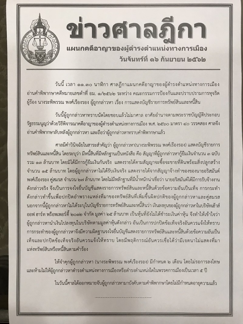 ผู้สื่อข่าวสำนักข่าวอิศรา www.isranews.org รายงานว่า เมื่อวันที่ 16 ก.ย. 2562 เวลาประมาณ 13.30 น. ศาลฎีกาแผนกคดีอาญาของผู้ดำรงตำแหน่งทางการเมือง พิพากษาจำคุก 2 เดือน ไม่รอการลงโทษ แก่นางระพิพรรณ พงศ์เรืองรอง อดีต ส.ส.พรรคเพื่อไทย ภรรยานนายอริสมันต์ พงศ์เรือง อดีตแกนนำ นปช. คดีแสดงบัญชีทรัพย์สินและหนี้สินอันเป็นเท็จ และปกปิดข้อเท็จจริงอันควรแจ้งให้ทราบแก่คณะกรรมการป้องกันและปราบปรามการทุจริตแห่งชาติ (ป.ป.ช.) อย่างไรก็ดีนางระพิพรรณไม่ได้เดินทางมาศาล จึงได้ออกหมายจับมาบังคับตามคำพิพากษาโดยไม่มีกำหนดอายุความแล้ว พร้อมกับพิพากษาคดีร่ำรวยผิดปกติ สั่งยึดทรัพย์ตกเป็นของแผ่นดินกว่า 42 ล้านบาทด้วย