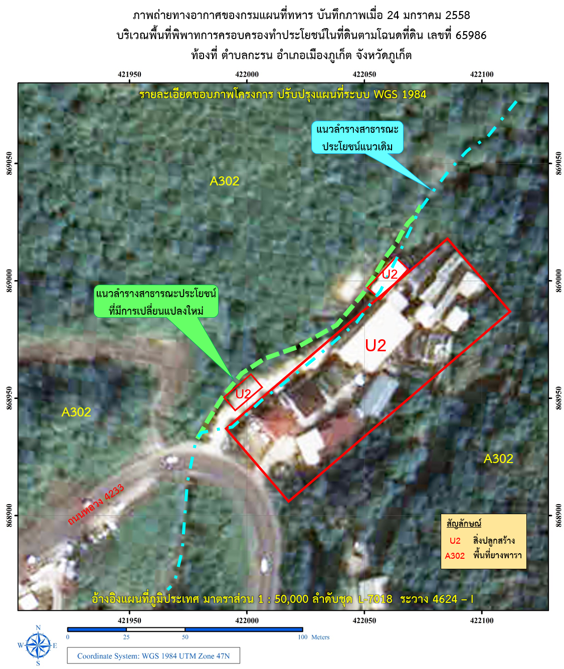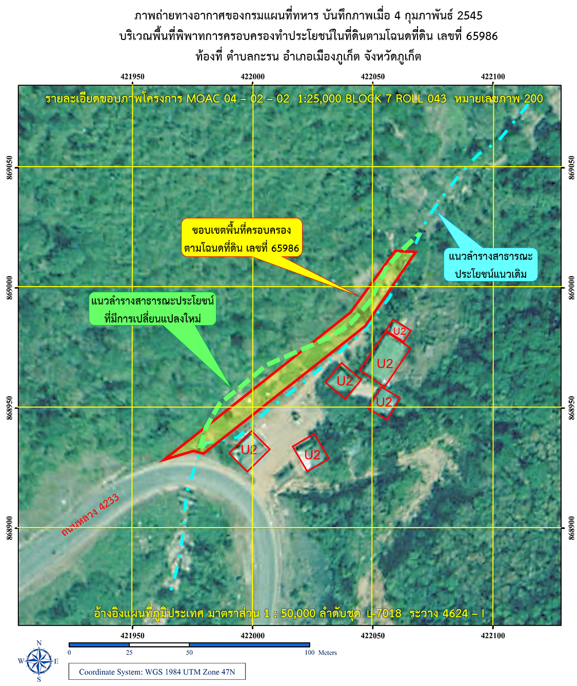 ปรากฎข้อมูลหลักฐานเป็นภาพถ่ายจากกรมแผนที่ทหารซึ่งแตกต่างกัน 2 ช่วงเวลา โดยในช่วงปี 2545 นั้นข้อมูลจากกรมแผนที่ทหารได้ระบุถึงที่ดินจำนวน 3 ส่วนด้วยกันคือที่ของบริษัทเอกชน (สีแดง เขียนคำว่า U2) พื้นที่ลำรางสาธารณะ(สีฟ้า) และพื้นที่ทำกินของชาวบ้านตามโฉนดเลขที่ 65986 (มีเส้นประสีเขียว)