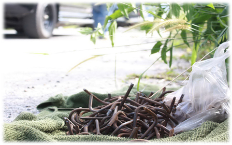 บรรยายภาพ : "ตะปูเรือใบ" ที่คนร้ายใช้โปรยตามท้องถนนเพื่อสกัดการเข้าพื้นที่เกิดเหตุของเจ้าหน้าที่ฝ่ายความมั่นคง หรือสกัดการติดตามไล่ล่าจับกุม ยังคงพบแทบทุกครั้งเมื่อมีการก่อเหตุรุนแรง (ภาพโดย อะหมัด รามันห์สิริวงศ์)