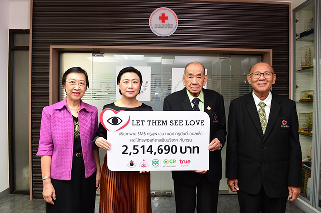 เมื่อวันที่ 25 ก.ย. 2562 นายแผน วรรณเมธี เลขาธิการสภากาชาดไทย นายแพทย์วิศิษฎ์ ฐิตวัฒน์ ผู้อำนวยการศูนย์รับบริจาคอวัยวะ และ ผู้ช่วยศาสตราจารย์ แพทย์หญิงลลิดา ปริยกนก ผู้อำนวยการศูนย์ดวงตา รับมอบเงินจำนวน 2,514,690 บาท จากเครือเจริญโภคภัณฑ์ และทรู คอร์ปอเรชั่น ภายใต้โครงการ “Let Them See Love 2019” ที่ลูกค้ากลุ่มทรู บริจาคผ่าน SMS ระบบทรูมูฟ เอช รวมถึงแอปพลิเคชันทรูมันนี่ วอลเล็ทและ การแลกทรูพอยท์ แทนเงินบริจาคกับทรูยู โดยมี นางรุ่งฟ้า เกียรติพจน์ ผู้บริหารฝ่ายโครงการพิเศษ เครือเจริญโภคภัณฑ์ เป็นตัวแทนส่งมอบ ณ อาคารเทิดพระเกียรติสมเด็จพระญาณสังวรฯ สภากาชาดไทย เพื่อสมทบทุนเป็นค่าใช้จ่ายในกระบวนการบริจาคอวัยวะและดวงตาอย่างต่อเนื่อง