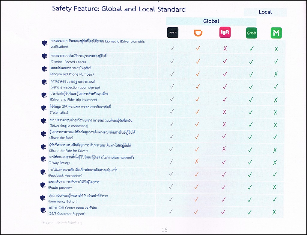 1.มาตรฐานความปลอดภัย ควรมีพนักงาน Call center ที่คอยรับแจ้งปัญหาและช่วยเหลือเมื่อเกิดเหตุฉุกเฉินตลอด 24 ชั่วโมง โดยแอปพลิเคชั่นสามารถรองรับเหตุการณ์ฉุกเฉิน ระบบเตือนภัย ระบบ Real-time GPS รวมไปถึงระบบการยืนยันตัวตนของผู้ขับขี่