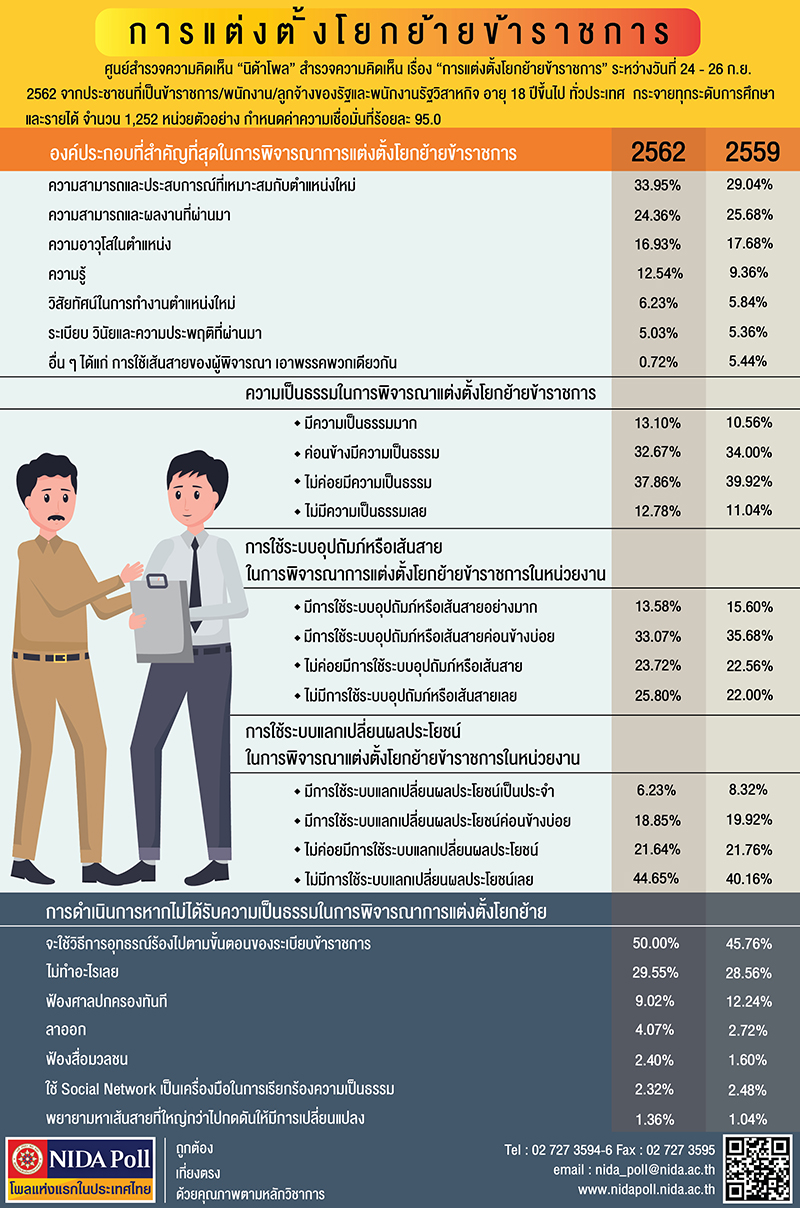 ศูนย์สำรวจความคิดเห็น “นิด้าโพล” สถาบันบัณฑิตพัฒนบริหารศาสตร์ (นิด้า) สำรวจความคิดเห็นของประชาชน เรื่อง “การแต่งตั้งโยกย้ายข้าราชการ” ทำการสำรวจระหว่างวันที่ 24 – 26 ก.ย. 2562 จากประชาชนที่เป็นข้าราชการ พนักงาน ลูกจ้างของรัฐและพนักงานรัฐวิสาหกิจที่มีอายุ 18 ปีขึ้นไปทั่วประเทศ กระจายทุกระดับการศึกษา รวมทั้งสิ้น จำนวน 1,252 หน่วยตัวอย่าง เกี่ยวกับองค์ประกอบที่สำคัญที่สุดในการพิจารณาการแต่งตั้งโยกย้ายข้าราชการ และความเป็นธรรมการแต่งตั้งโยกย้ายข้าราชการ