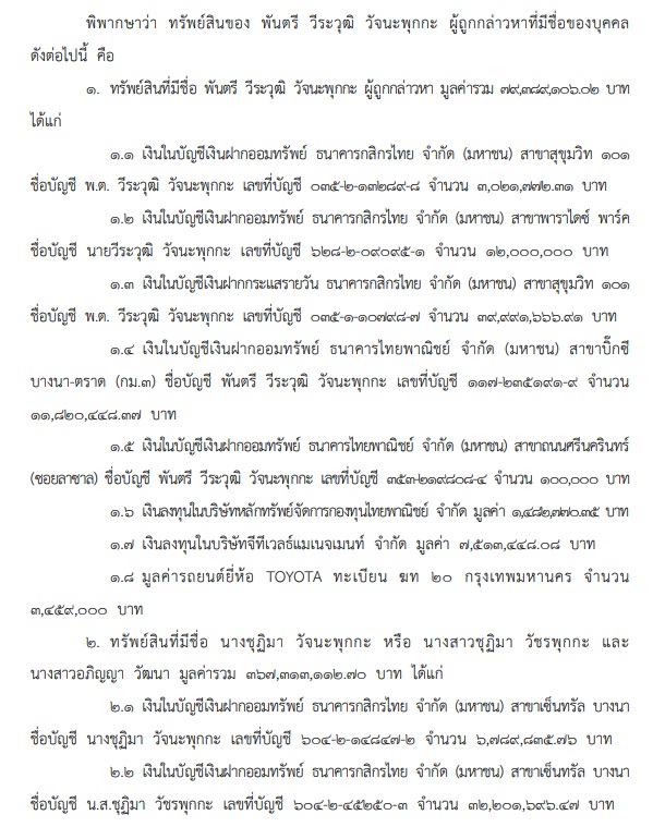 จากกรณีเมื่อวันที่ 17 พ.ค. 2562 ศาลฎีกาแผนกคดีอาญาของผู้ดำรงตำแหน่งทางการเมือง พิพากษายึดทรัพย์ พ.ต.นพ.วีระวุฒิ วัจนะพุกกะ อดีตเลขานุการ รมว.พาณิชย์ เนื่องจากมีพฤติการณ์ร่ำรวยผิดปกติ 896,554,760 บาท พร้อมดอกผลให้ตกเป็นของแผ่นดิน