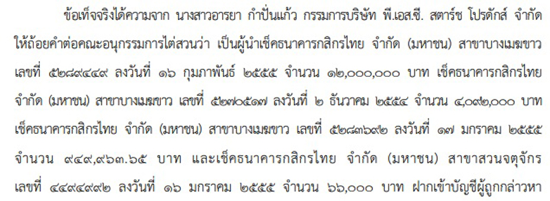 ‘สยามรักษ์-พี.เอส.ซี. สตาร์ชฯ’จ่ายเช็คเข้าบัญชี‘หมอโด่ง-อดีตเมีย’คดีรวยผิดปกติ