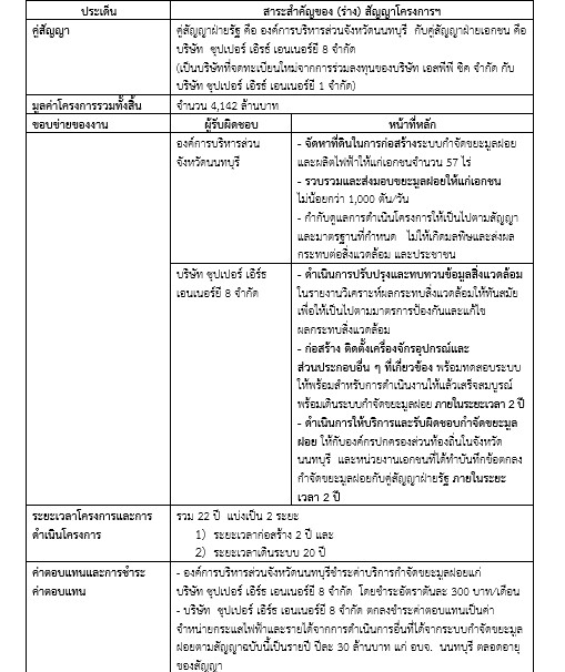 ทั้งนี้ องค์การบริหารส่วนจังหวัดนนทบุรีได้ดำเนินการปรับ (ร่าง) สัญญาโครงการฯ ตามข้อคิดเห็นดังกล่าว โดยสามารถสรุปสาระสำคัญของ (ร่าง) สัญญาโครงการฯ ได้ ดังนี้