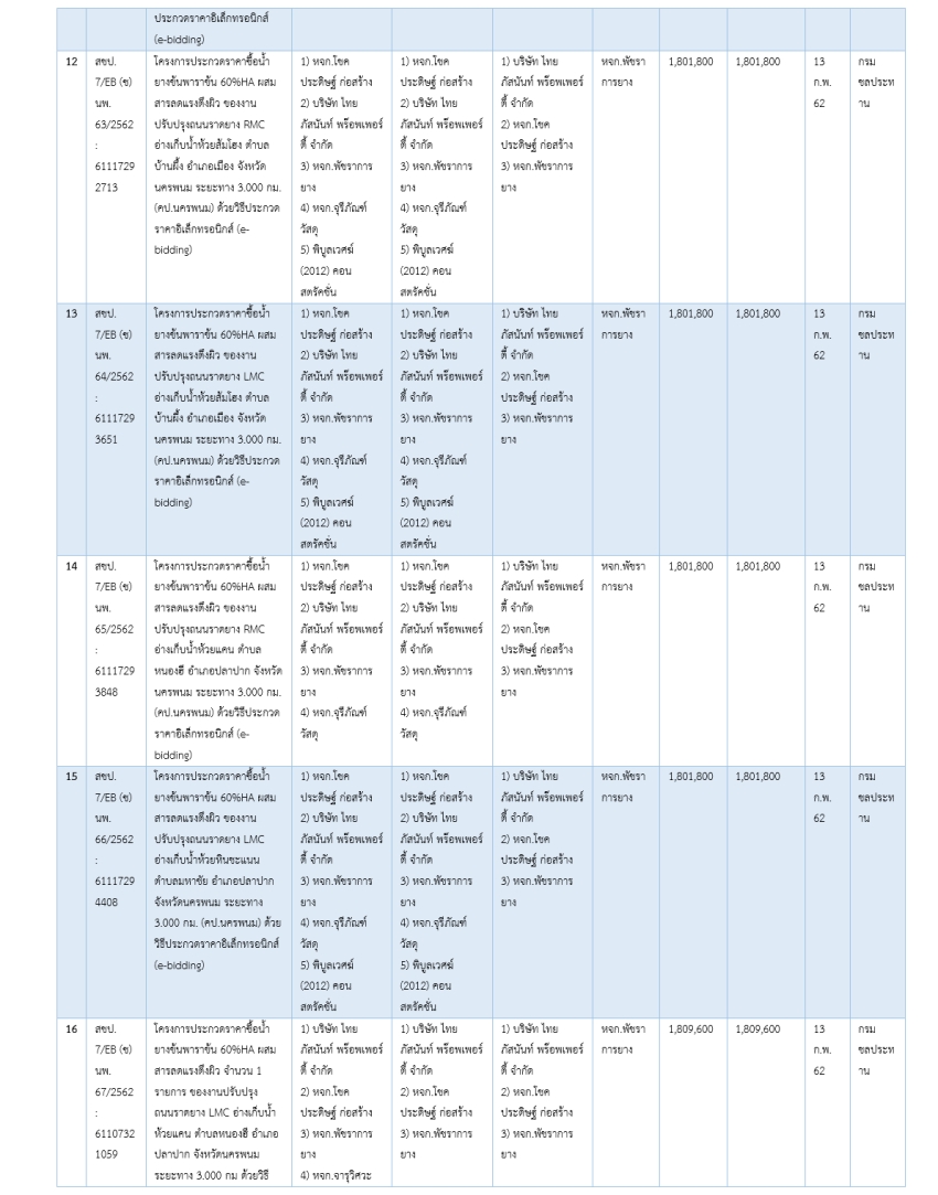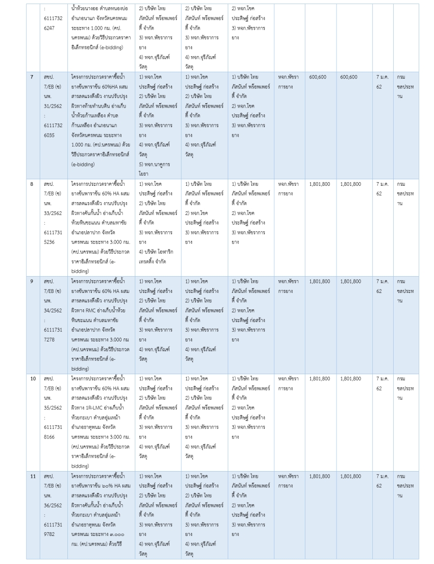 ทั้งนี้ ในทุกสัญญาในขั้นตอนประกาศรายชื่อผู้ผ่านคุณสมบัติและเทคนิค ปรากฏรายชื่อ หจก.พัชราการยาง บริษัท ไทย ภัสนันท์ พร๊อพเพอร์ตี้ จำกัด และหจก.โชคประดิษฐ์ก่อสร้าง เพียง 3 รายเท่านั้น รายละเอียดตามตารางต่อไปนี้