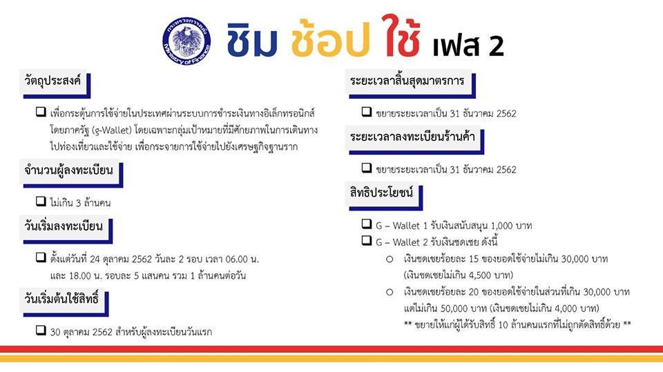 นอกจากนี้ กระทรวงการคลังจะปรับเวลาเริ่มลงทะเบียนใหม่ โดยแบ่งเป็น 2 รอบ รอบละ 500,000 รายรอบแรกเริ่มลงทะเบียนเวลา 6.00 น. และรอบที่ 2 เริ่มลงทะเบียนเวลา 18.00 น. เพื่ออำนวยความสะดวกให้แก่ประชาชนผู้สนใจลงทะเบียน ซึ่งจะเริ่มเปิดรับลงทะเบียนตั้งแต่วันที่ 24 ตุลาคม 2562 จำนวนวันละไม่เกิน 1 ล้านคน โดยมาตรการ “ชิมช้อปใช้ เฟส 2” นี้ ประชาชนสามารถใช้ได้ถึงวันที่ 31 ธันวาคม 2562 และร้านค้าสามารถสมัครเข้าร่วมมาตรการได้ถึง 31 ธันวาคม 2562 เช่นกัน