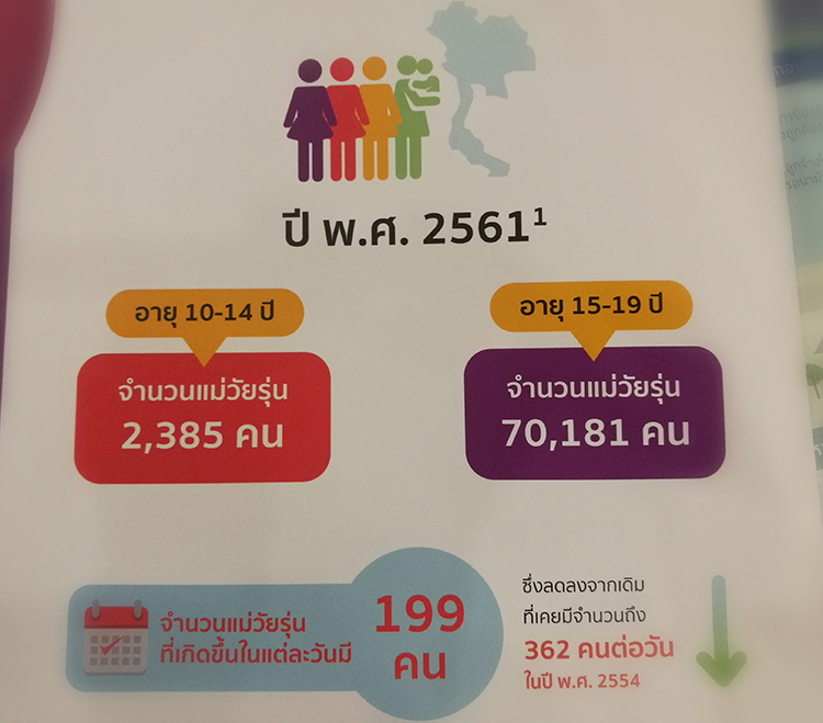 นอกจากนี้ ข้อมูลปี 2561 พบว่า แม่วัยรุ่น (อายุ 10-14 ปี) มีจำนวน 2,385 คน แม่วัยรุ่น (15-19ปี) มีจำนวน 70,181 คน โดยจำนวนแม่วัยรุ่นที่เกิดในแต่ละวันมีถึง 199 คน ซึ่งลดลงจากเคยมีจำนวนถึง 362 คนต่อวันในปี2554