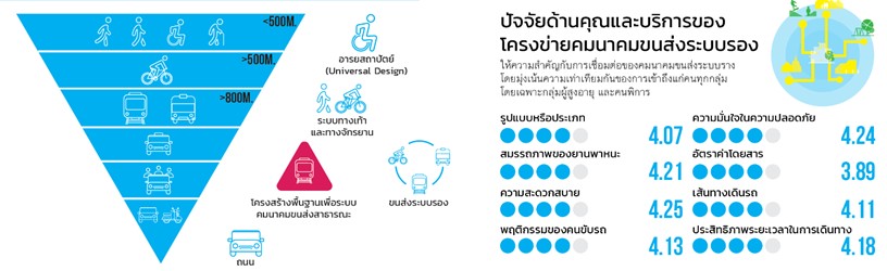 ขนส่งสาธารณะทุกรูปแบบมีข้อดีข้อเสีย คือ ไม่เป็น Door To Door ฉะนั้นต้องมีการบริหารการเข้าถึงการออกจากระบบ ซึ่งมีผลการศึกษา คนเราจะยอมเสียเวลาในการเดินทางด้วยระบบขนส่งทุกวันไม่เกิน 1.5 ชั่วโมง เกินกว่านี้ถือเป็นความรำคาญ โดยเฉพาะเวลาที่ใช้ในการรอ ฉะนั้นจุดเชื่อมต่อทั้งหลายทำให้เสียเวลาในการรอ