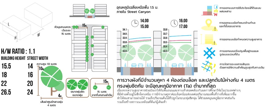 โครงการที่ 3 “กลยุทธ์การวางแผนเมืองและออกแบบสิ่งแวดล้อม เพื่อเอื้อต่อการพัฒนาบริเวณรอบสถานีขนส่งมวลชนระบบราง” ในการออกแบบสิ่งแวดล้อมเมือง เป็นส่วนหนึ่งของกลยุทธ์ในการวางแผนและออกแบบสิ่งแวดล้อม เนื่องจากมีอิทธิพลต่อการสร้างองค์ประกอบของรูปแบบเมือง (Elements of Urban Form) ที่มีผลต่อลักษณะสภาพภูมิอากาศของเมือง เพื่อให้คนเกิดสภาวะความสบายภายนอกอาคารมากที่สุด ภายใต้การใช้ดัชนีความสบายเชิงความร้อน (Outdoor thermal comfort index) โดยสามารถสรุปแนวทางของการพัฒนาพื้นที่ออกเป็น 4 ประเด็น ได้แก่ (1) ทิศทางการวางอาคารตามแนวถนน (2) สัดส่วนความสูงอาคารต่อความกว้างถนน (3) ความหนาแน่นของต้นไม้ (4) ความหนาแน่นของอาคาร โดยรายละเอียดดังภาพ