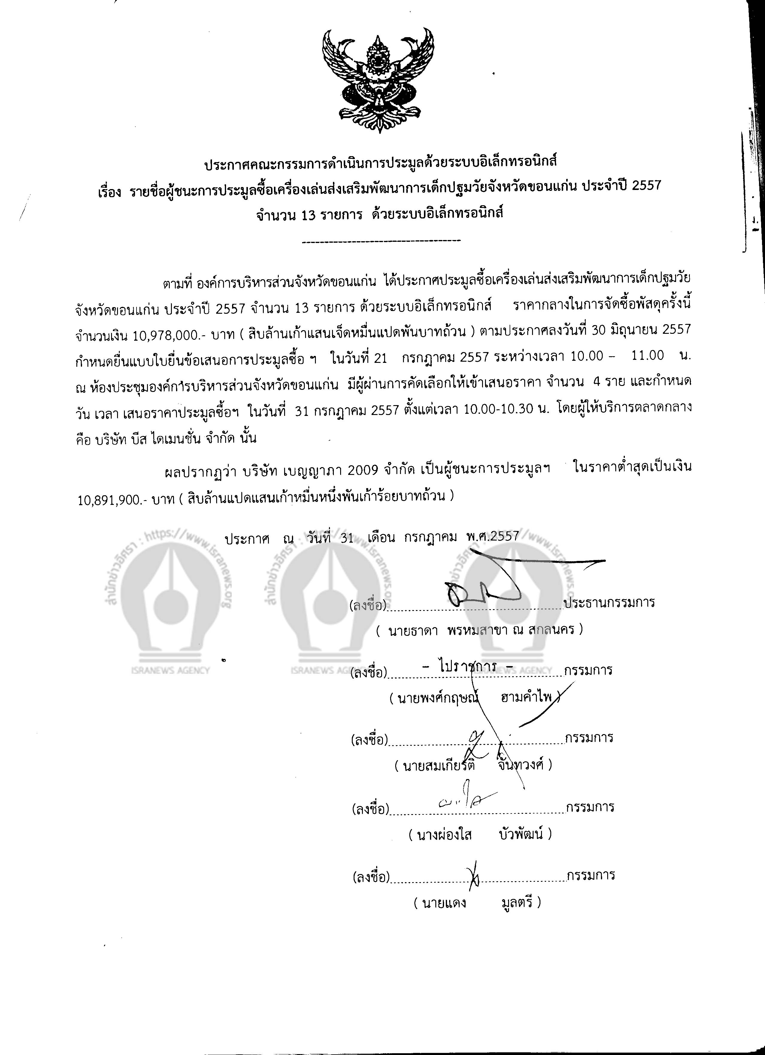 "...ในช่วงปี 2557 อบจ.ขอนแก่น ทำสัญญาจัดซื้อเครื่องเล่นส่งเสริมพัฒนาการเด็กปฐมวัย มาจากเอกชน 2 ราย ดังนี้ สัญญาแรก เลขที่ 35/2557 ตกลงซื้อขายเครื่องเล่นส่งเสริมพัฒนาการเด็กปฐมวัยจังหวัดขอนแก่น ประจำปี 2557 จำนวน 13 รายการ จาก บริษัท เบญญาภา 2009 จำกัด วงเงิน 10,891,900 บาท ลงนามวันที่ 4 ส.ค. 57 สิ้นสุดสัญญา 3 ก.ย. 57 สัญญาสอง เลขที่ 8/2558 ซื้อเครื่องเล่นส่งเสริมพัฒนาการเด็กปฐมวัยจังหวัดขอนแก่น ระยะที่ 2 ประจำปี 2557 จำนวน 3 รายการ จากบริษัท แซมซินเนอร์ยี่ จำกัด วงเงิน 26,740,800 บาท ลงนามวันที่ 15 ธ.ค. 57 สิ้นสุด 13 ก.พ. 58..."
