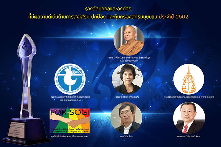 คณะกรรมการสิทธิมนุษยชนแห่งชาติ (กสม.) ในคราวประชุม กสม. ด้านบริหาร ครั้งที่ 24/2562 เมื่อวันที่ 12 พ.ย. 2562 มีมติเห็นชอบรายชื่อบุคคลและองค์กรที่สมควรได้รับรางวัลบุคคลและองค์กรที่มีผลงานดีเด่นด้านการส่งเสริม ปกป้อง และคุ้มครองสิทธิมนุษยชน ประจำปี 2562 เพื่อเป็นการยกย่อง เชิดชู และประกาศเกียรติคุณบุคคลและองค์กรที่อุทิศตนปฏิบัติงานเพื่อส่งเสริม ปกป้อง และคุ้มครองสิทธิมนุษยชน ให้สังคมได้รับรู้และถือเป็นแบบอย่าง โดยมีบุคคลและองค์กรที่สมควรได้รับรางวัลทั้งสิ้น จำนวน 7 ราย แบ่งตามประเภทรางวัล 7 ด้าน ดังรายชื่อต่อไปนี้