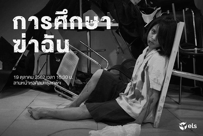 ซึ่งเป็นภาพจริงที่สะท้อนกลับไปยังนิทรรศการเชิงสัญญลักษณ์ชื่อว่า “การศึกษาฆ่าฉัน” ที่จัดขึ้นเมื่อปลายเดือนที่แล้วที่หอศิลปกรุงเทพ ที่เป็นการส่งเสียงเรียกร้องให้สังคมมาช่วยกันรับรู้ความรู้สึกกดดันของเด็กๆ ภายใต้การศึกษาที่ยังอยู่ในกรอบเดิมๆ ที่ไม่ให้เด็กนักเรียนได้มีอิสระในการแสดงออก ทั้งด้านศักยภาพ ความอิสระด้านความคิด ภายใต้คำว่า “กฎระเบียบ” และ “หลักสูตรกระทรวงฯ”