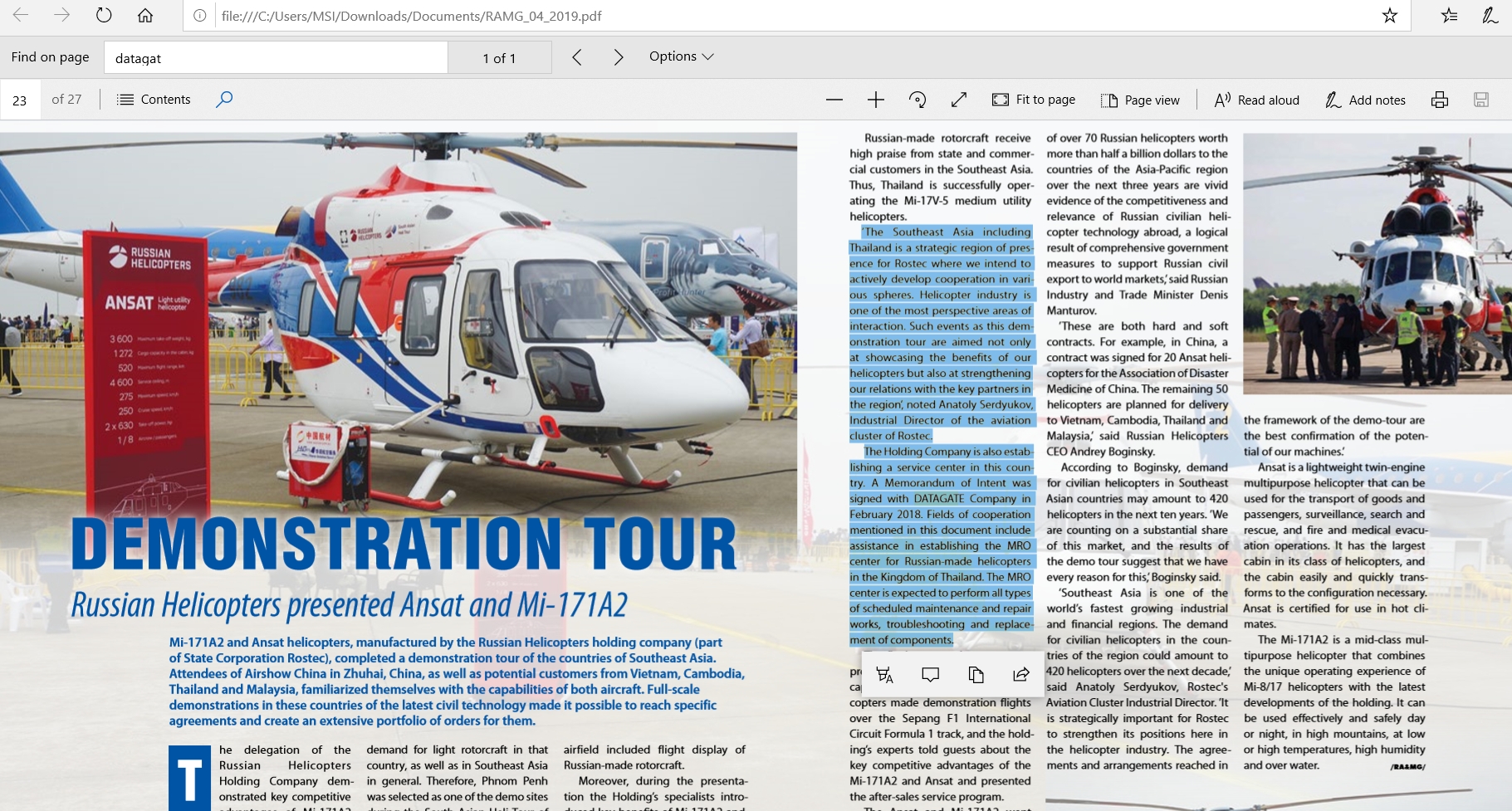"...บทความชิ้นนี้ อ้างคำให้สัมภาษณ์ของ นายอนาโตลี เซอดูคอฟ ว่า “ภูมิภาคเอเชียตะวันออกเฉียงใต้ รวมถึงประเทศไทยนั้นเป็นพื้นที่ทางยุทธศาสตร์ของบริษัท Rostec ในปัจจุบัน โดยเรา (บริษัท Rostec )ตั้งใจที่จะเสริมสร้างความร่วมมือกันในหลายระดับ ซึ่งอุตสาหกรรมเฮลิคอปเตอร์นั้นถือได้ว่าเป็นเป้าหมายหลักที่ได้รับการตอบสนองสูงสุดในภูมิภาคนี้ ดังนั้นเป้าหมายในการลงพื้นที่เพื่อสาธิตผลิตภัณฑ์นั้นจึงไม่ใช่แค่ต้องการจะแสดงออกถึงศักยภาพของเฮลิคอปเตอร์เพียงอย่างเดียวเท่านั้น แต่ยังรวมถึงการเสริมสร้างความสัมพันธ์ระหว่างองค์กรของเรากับผู้ค้าหลักในภูมิภาคด้วย” ..."